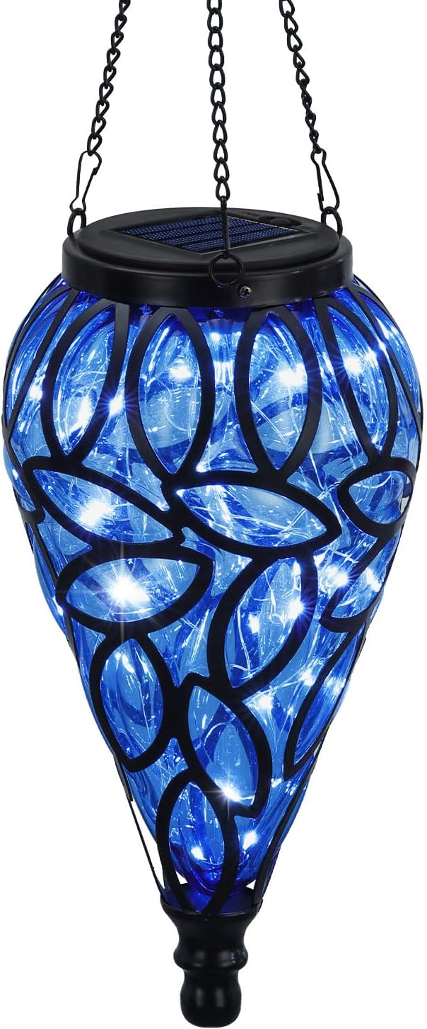 • Unique Design: Translucent plastic ceiling lantern features an inverted teardrop shape surrounded by a leaf frame metal cage with a plastic lampshade in blue. The solar hanging lantern will sparkle in the sunshine during the day.
