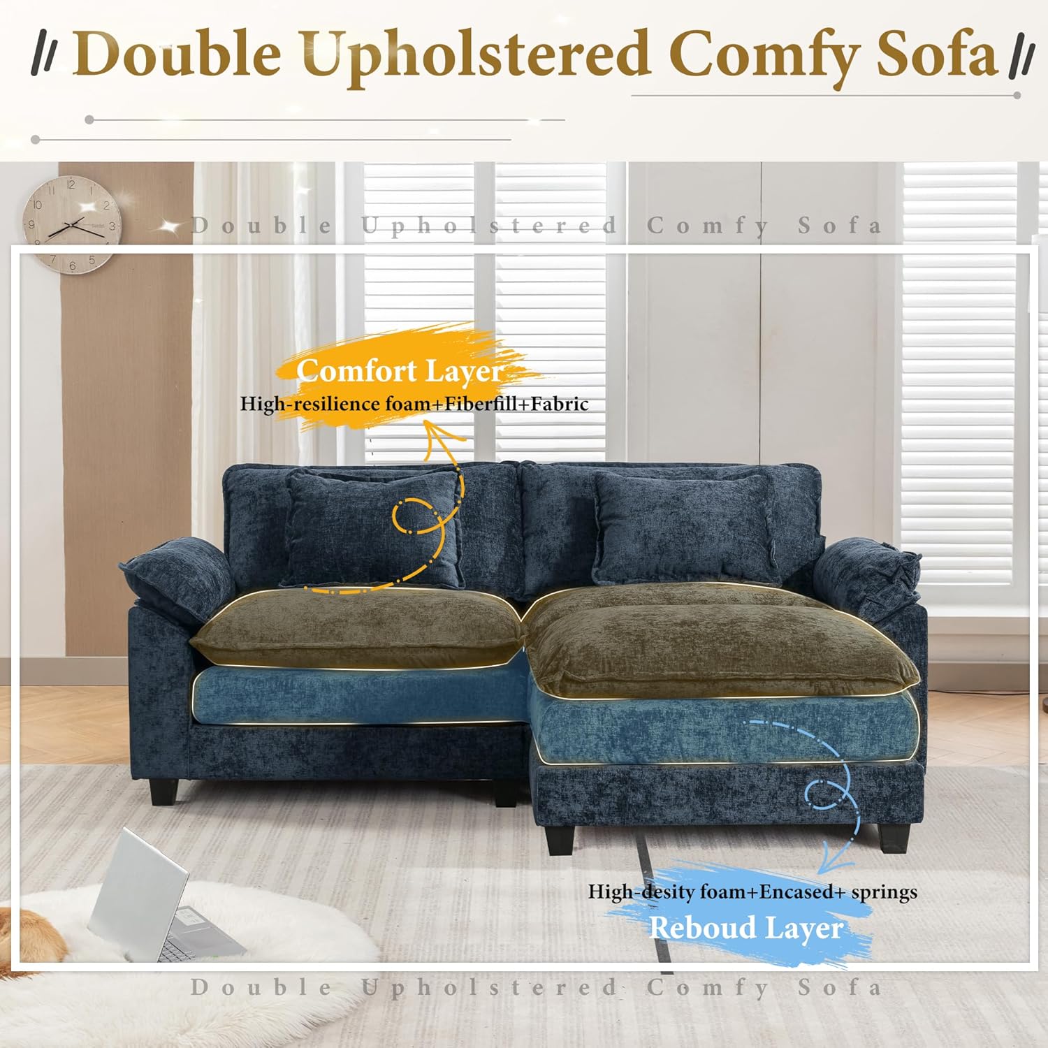 • Double Upholstered Sofa:The living room creative sofa is double thickly upholstered with high-density sponge padding and spring system, bringing luxurious comfort and support, greatly avoiding collapsing during long-term use.
