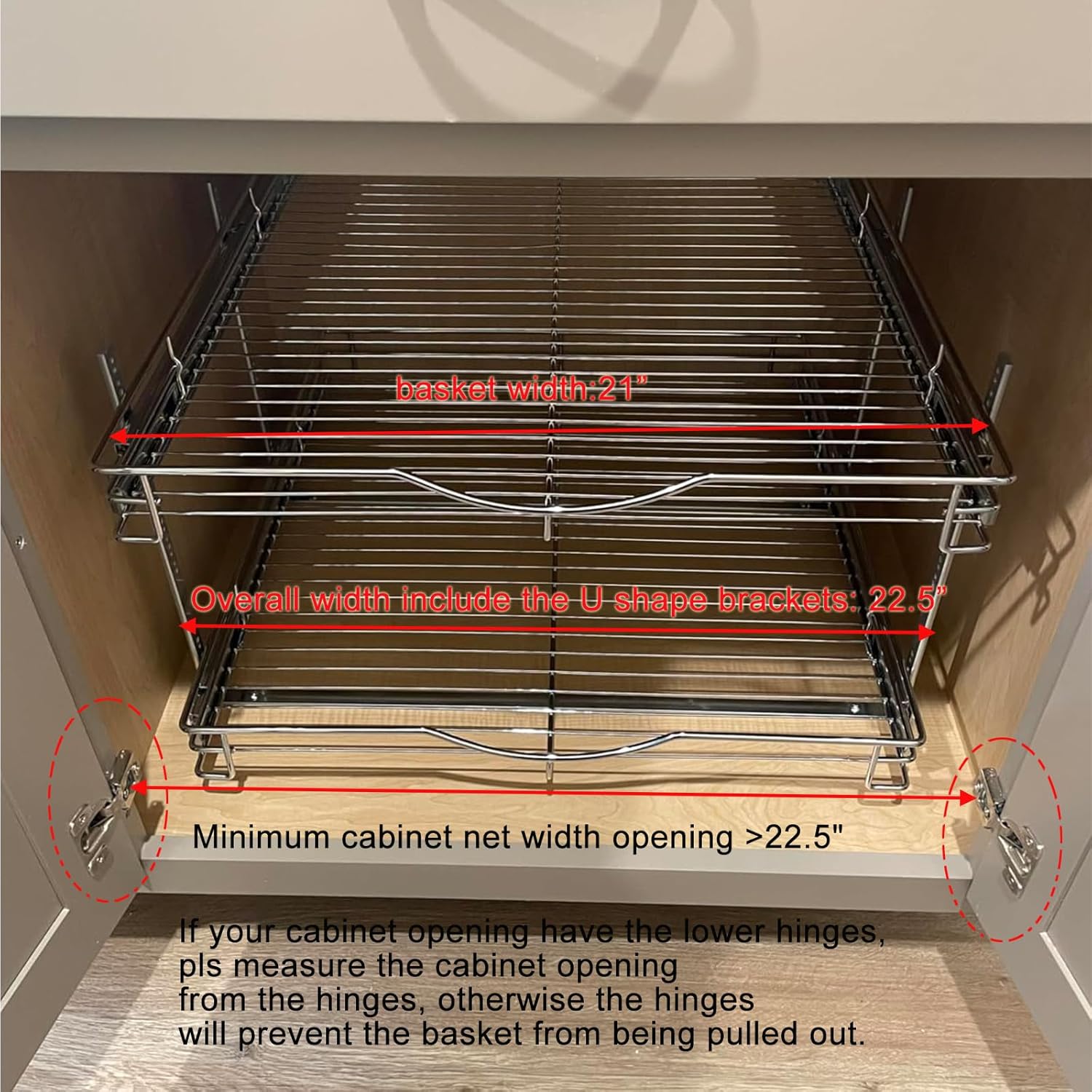 • 👍【Product Size】DINDON 2 tier pull out cabinet organizer --- 👍Overall Size is 22-1/2“ W x 21-1/2"D x 15"H, this size refer to the maximum width Including the U-shape brackets, 👍 Actual The Basket Size is 21"W x 21-1/2" D x2-3/8”H. Fits cabinet with more than 22-1/2“ W clearance between door hinges or larger. Min cabinet interior depth: 23 inch. If your cabinet has hinges, measure the width from the hinges, otherwise the hinges will prevent the basket from being pulled out.