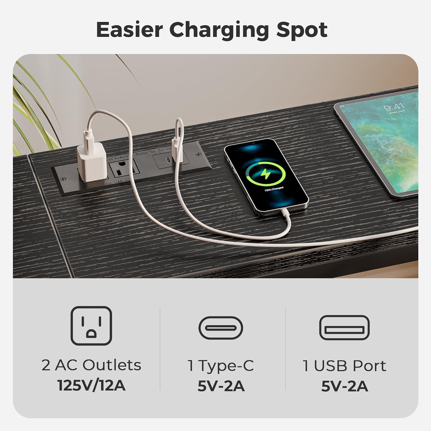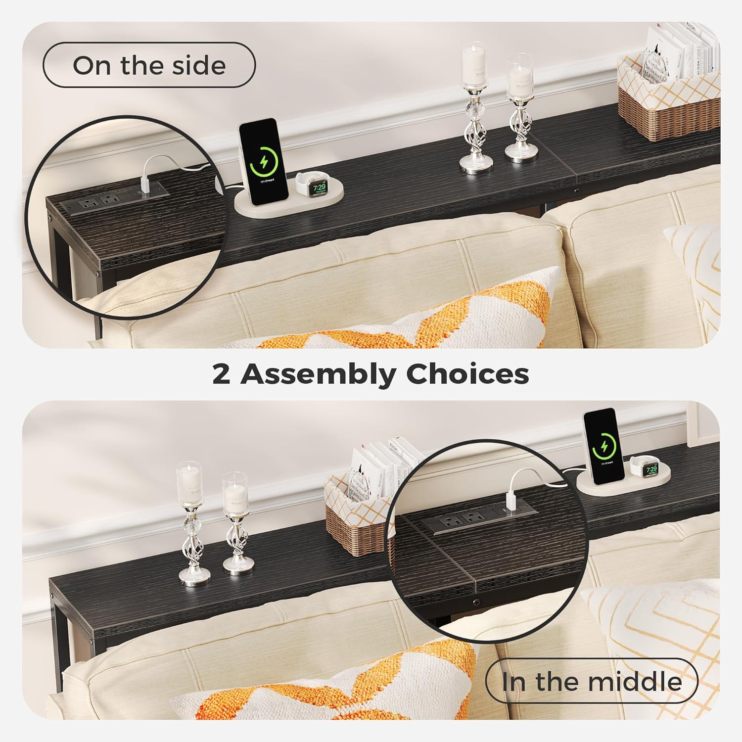 • [No Low Battery Warnings]: Imagine lounging on your sofa and brushing your phones to relax after a busy week. Don’t let low battery disappoint you. Let this sofa table narrow long with 2 AC outlets, 1 USB port and 1 Type-C port provide close-at-hand power