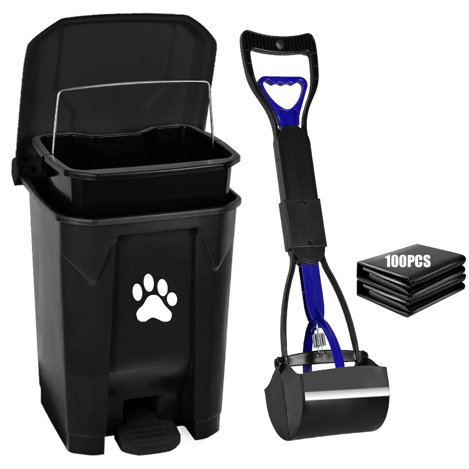 • OUTDOOR DOG POOP TRASH CAN SET: The package includes ONE FULLY ASSEMBLED TRASH CAN (Black) with removable inner bin, ONE LONG HANDLE POOPER SCOOPER and 100PCS LARGE WASTE BAGS. A perfect set for family with dogs.