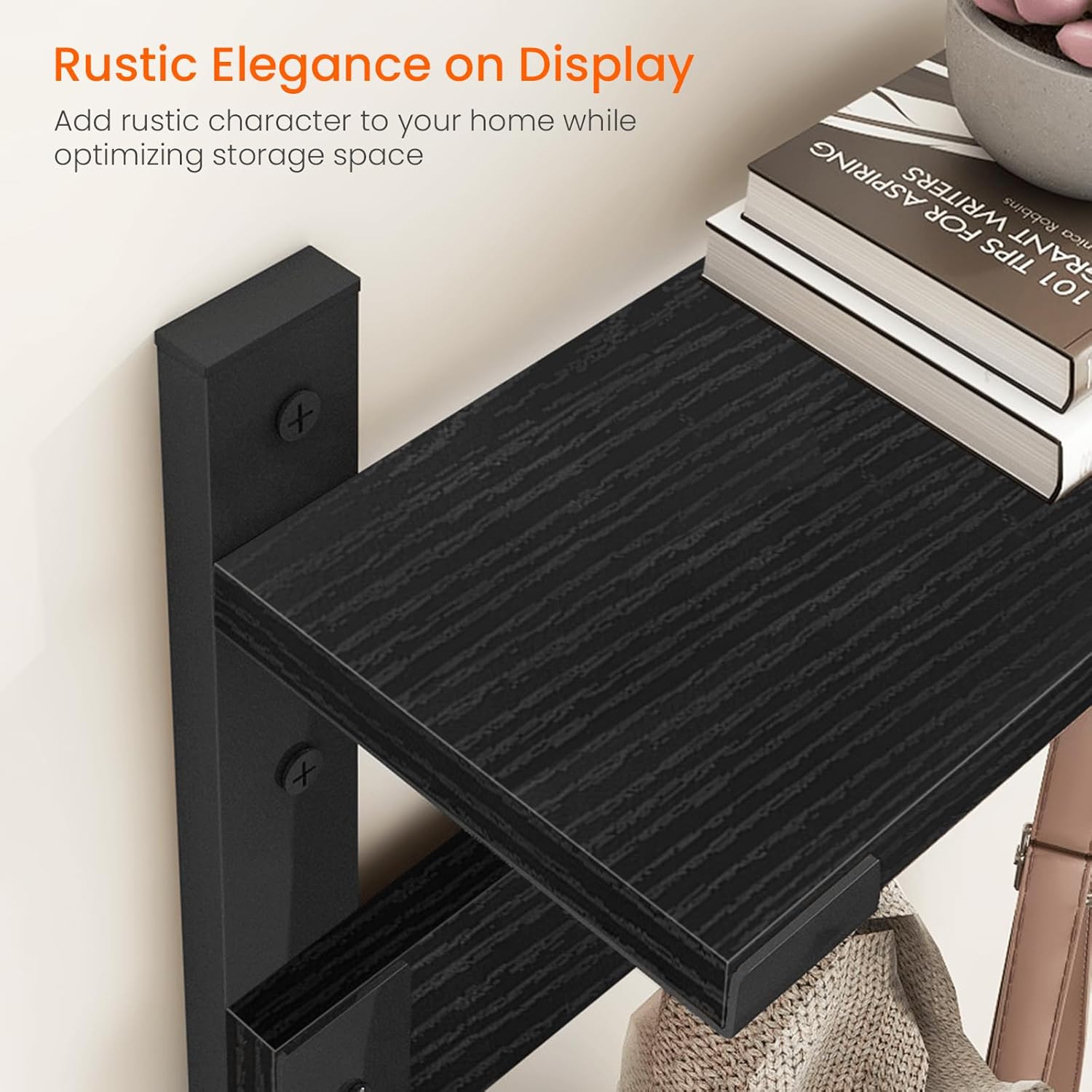 • VERSATILE USES: The black coat hooks with shelf is seamlessly blending with various home decors, from modern to rustic while ensures all your essentials are organized and easily accessible; Ideal for any space needing a blend of storage and style