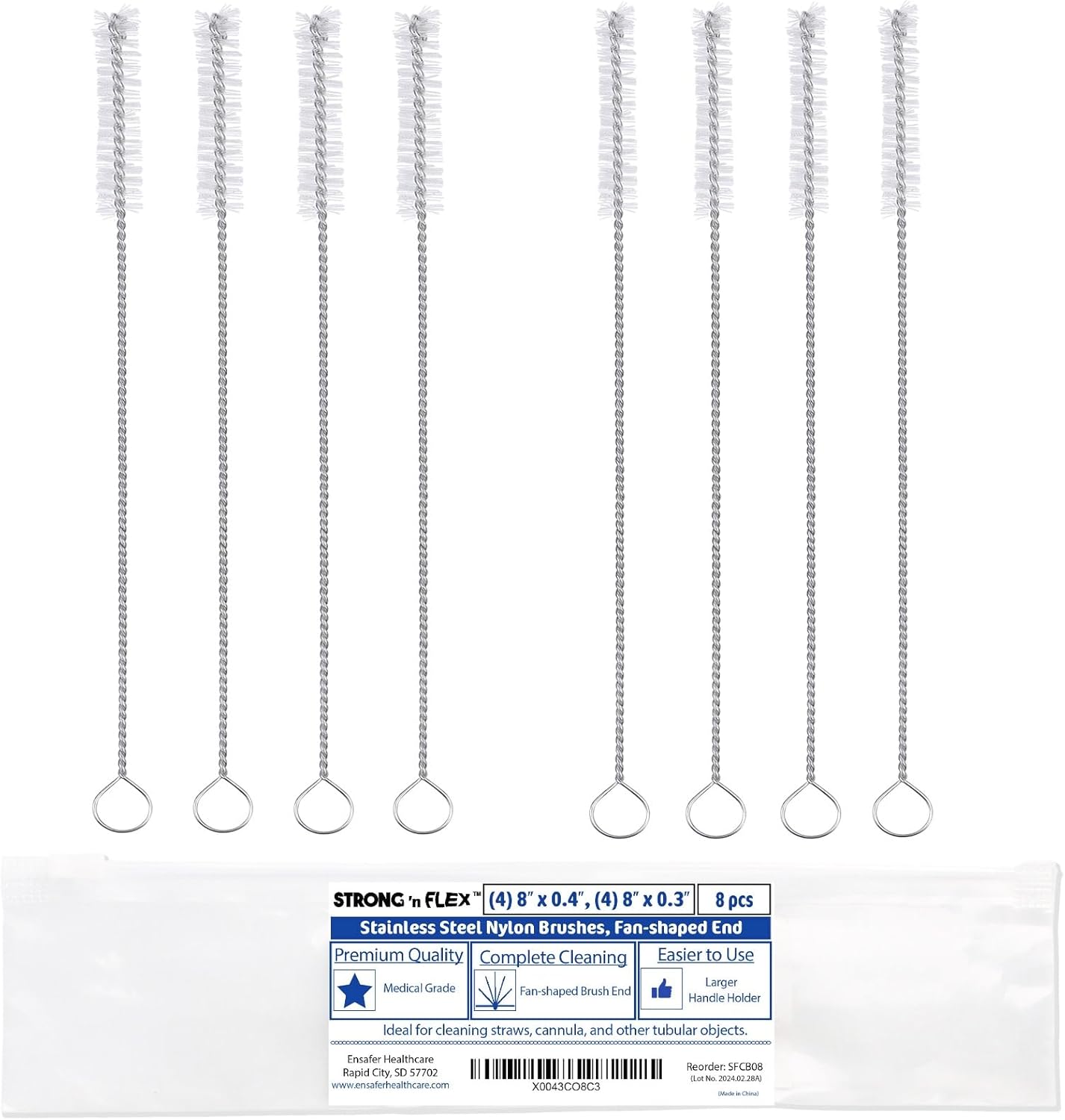 Strong 'n Flex Nylon Straw Cleaner Brushes – Fan-Shaped End for Tight Spaces, Ideal for Reusable Straws, Water Bottles, Sippy Cups & Pipes – Includes Zippered Pouch – 8" Long – Set of 8