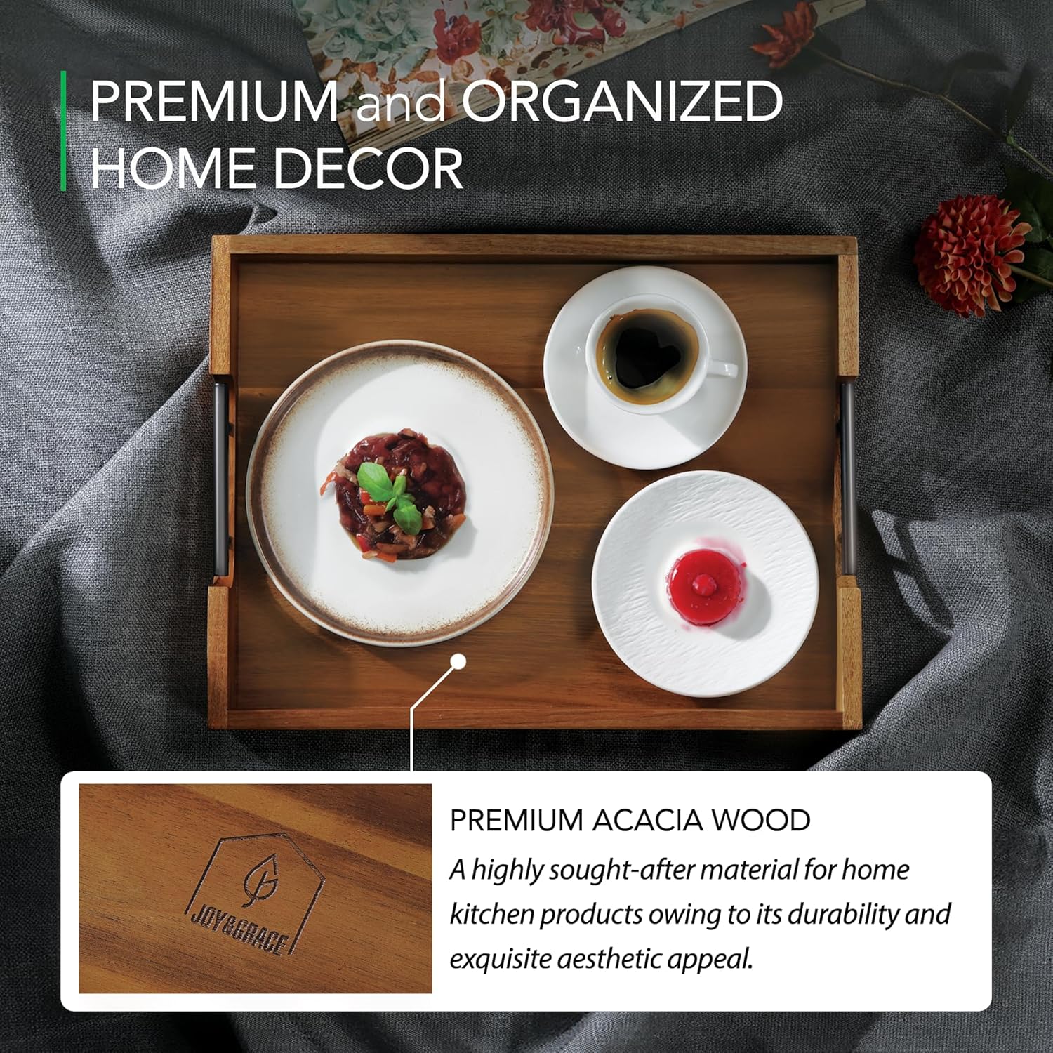 Joy&Grace Ottoman Tray for Living Room 16.7 x 12.8 inch Large Acacia Wooden Serving Tray with Handles for Coffee Table, Breakfast in Bed, Food Dinner, Decorative Rectangular Tray (Color Natural)