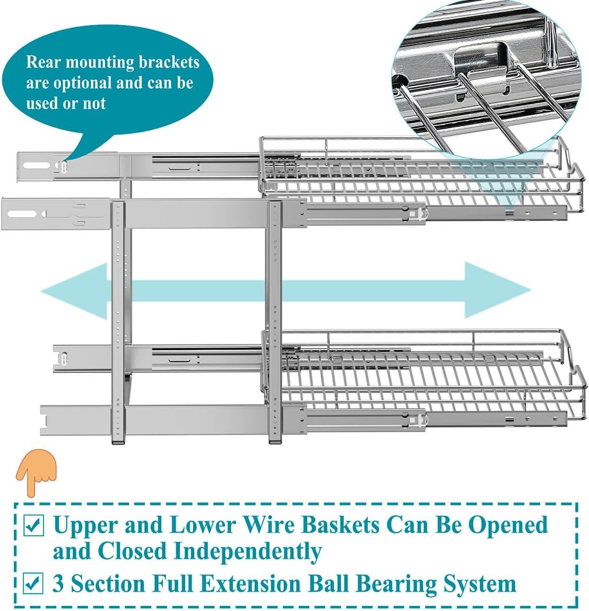 • Easy to Install: Comes with step by step installation manual,mounting template and all the hardware necessary for a quick, easy install. Both upper and lower wire baskets slide out independently on precision ball bearing slides so you can reach to your items easily and more quickly.