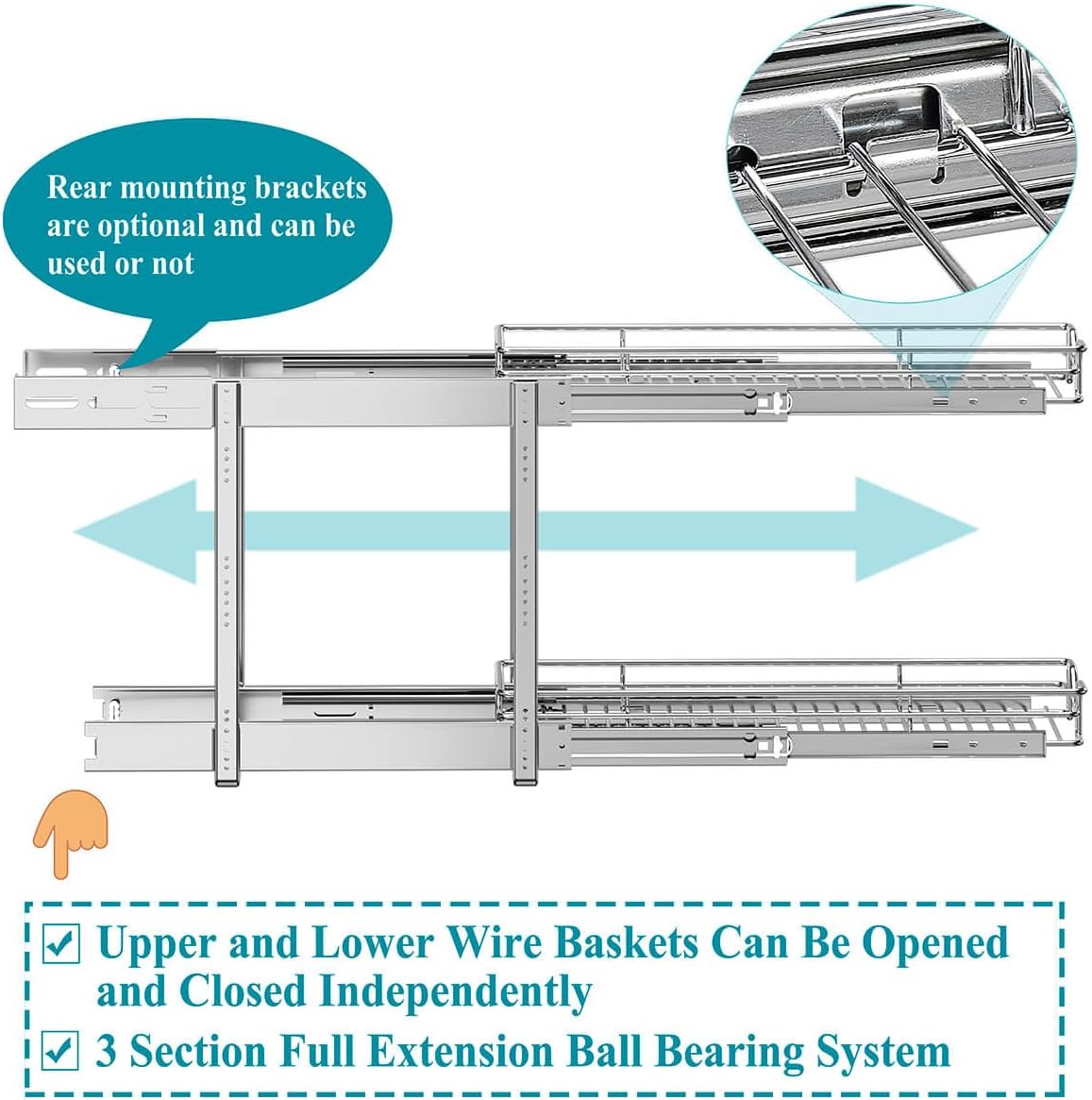 • Easy to Install: Comes with step by step installation manual,mounting template and all the hardware necessary for a quick, easy install. Both upper and lower wire baskets slide out independently on precision ball bearing slides so you can reach to your items easily and more quickly.