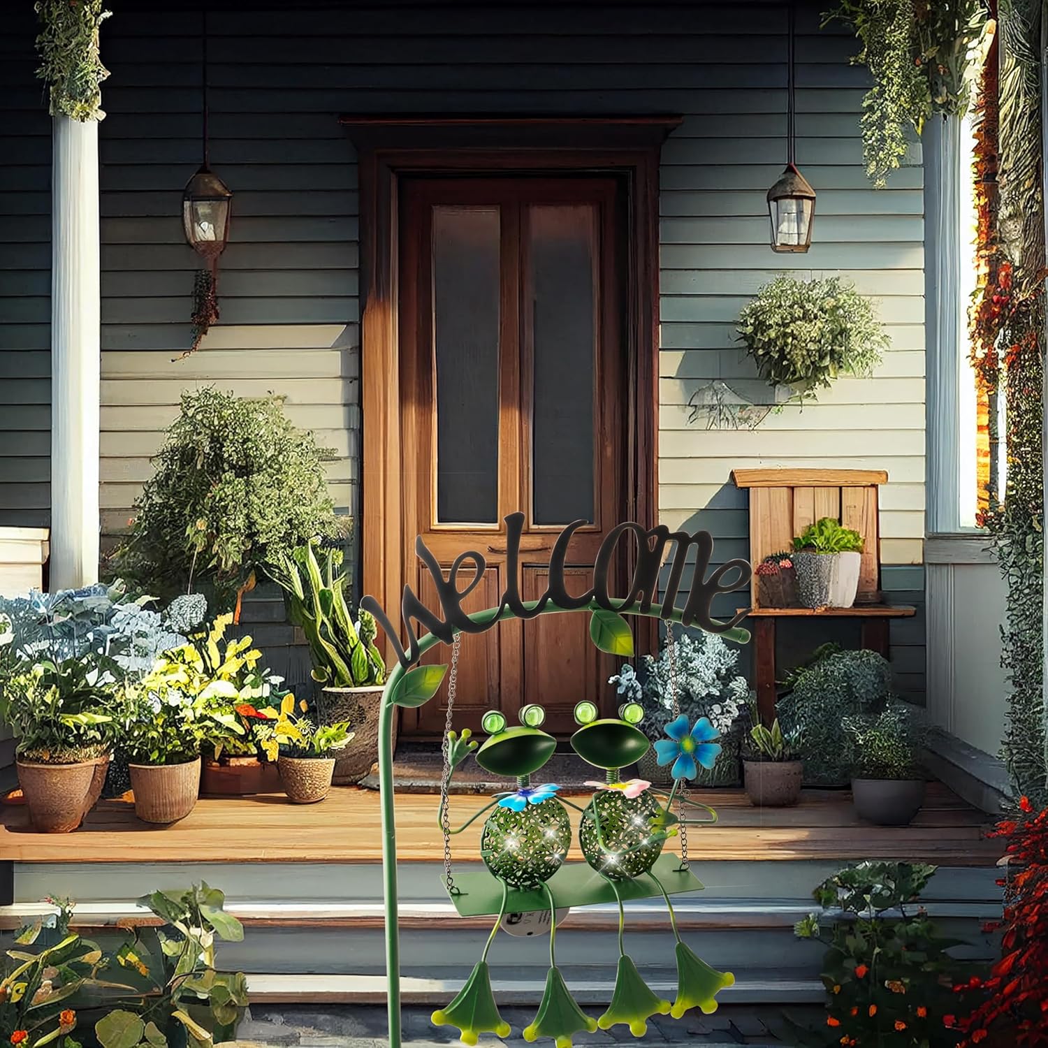 Frog Solar Light Garden Outdoor Decoration Swing Metal Stake Lamp with Welcome Sign Waterproof Patio Yard Decor Gifts-48 inch