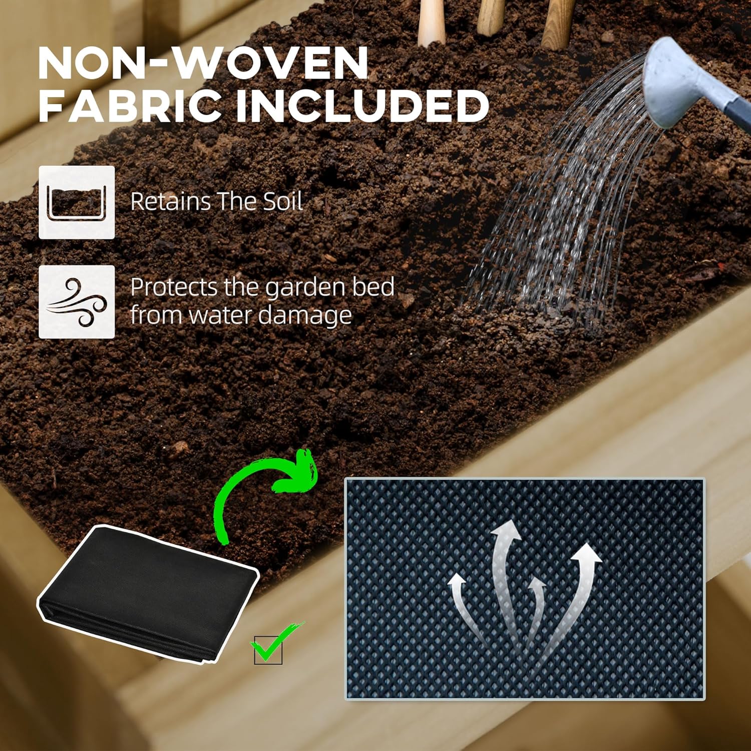 • Self-Draining Planters: Why worry about water logging? This vegetable planter set is self-draining, and it includes a non-woven fabric filter to stop soil from falling through after watering.