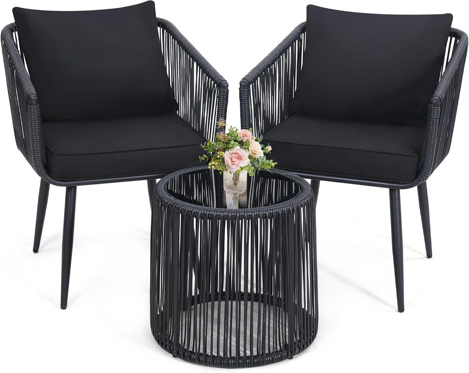 Kromax 3 Pieces Patio Rattan Bistro Conversation Set, Outdoor All-Weather Wicker Furniture Chairs and Side Table Set Ideal for Balcony, Porch and Backyard, Black