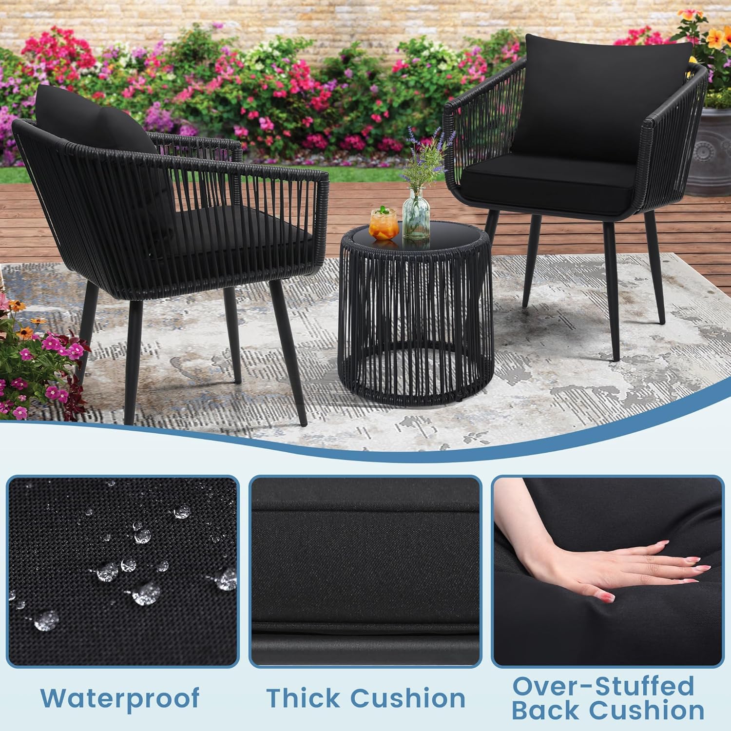 • 【WHATS INCLUDED】 Each 3 pieces bistro conversation set includes 4 overstuffed waterproof zippered cushions, 1 cocktail table with a tempered glass top, and 2 boho style indoor outdoor chairs.