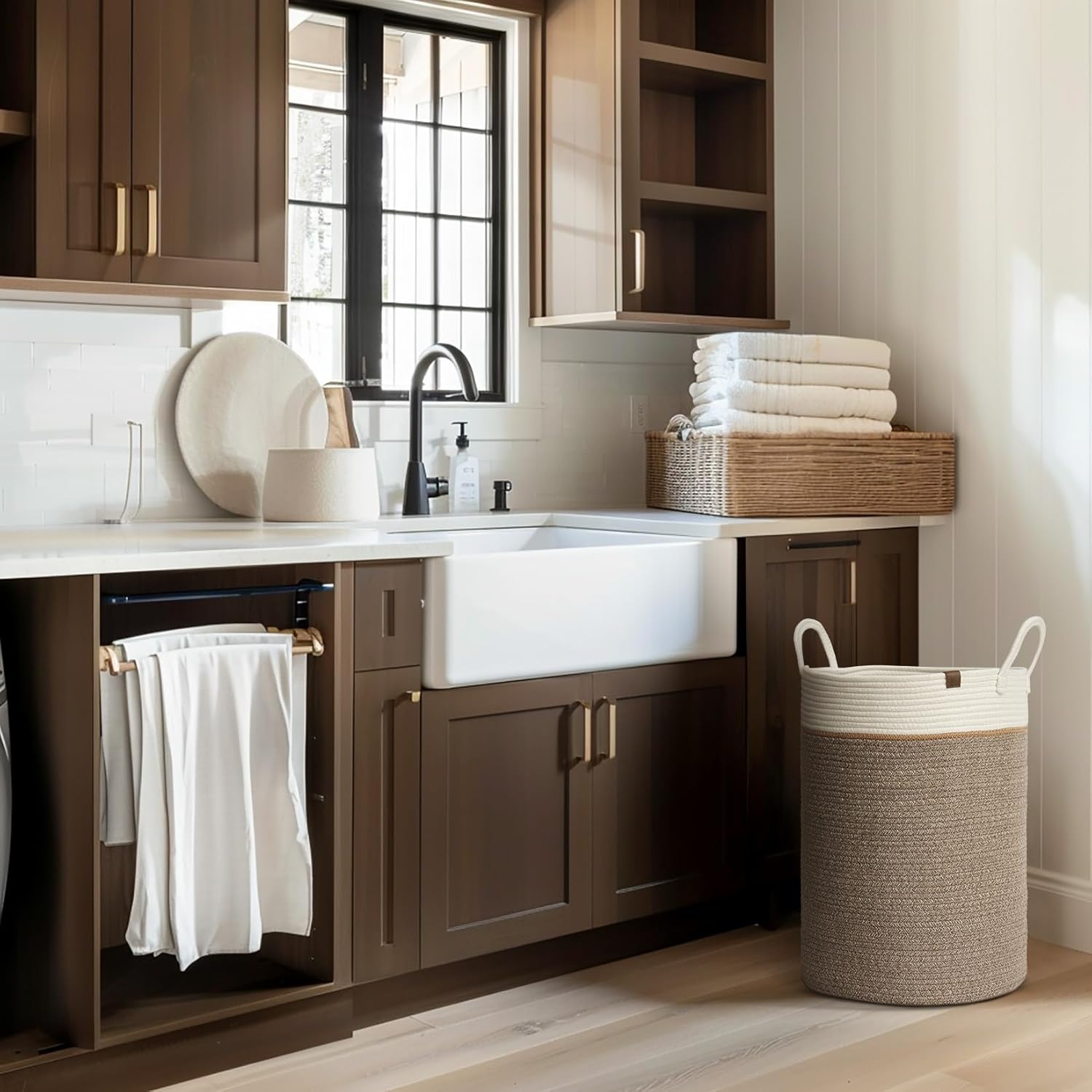 • COTTON ROPE LAUNDRY BASKET - Crafted with meticulous attention to detail, this laundry basket features premium GRS (Global Recycled Standard) certified braided cotton rope for enhanced durability and structural integrity. With its palette of white and mocha, this cotton laundry basket adds a warm, inviting vibe, perfect for any season.