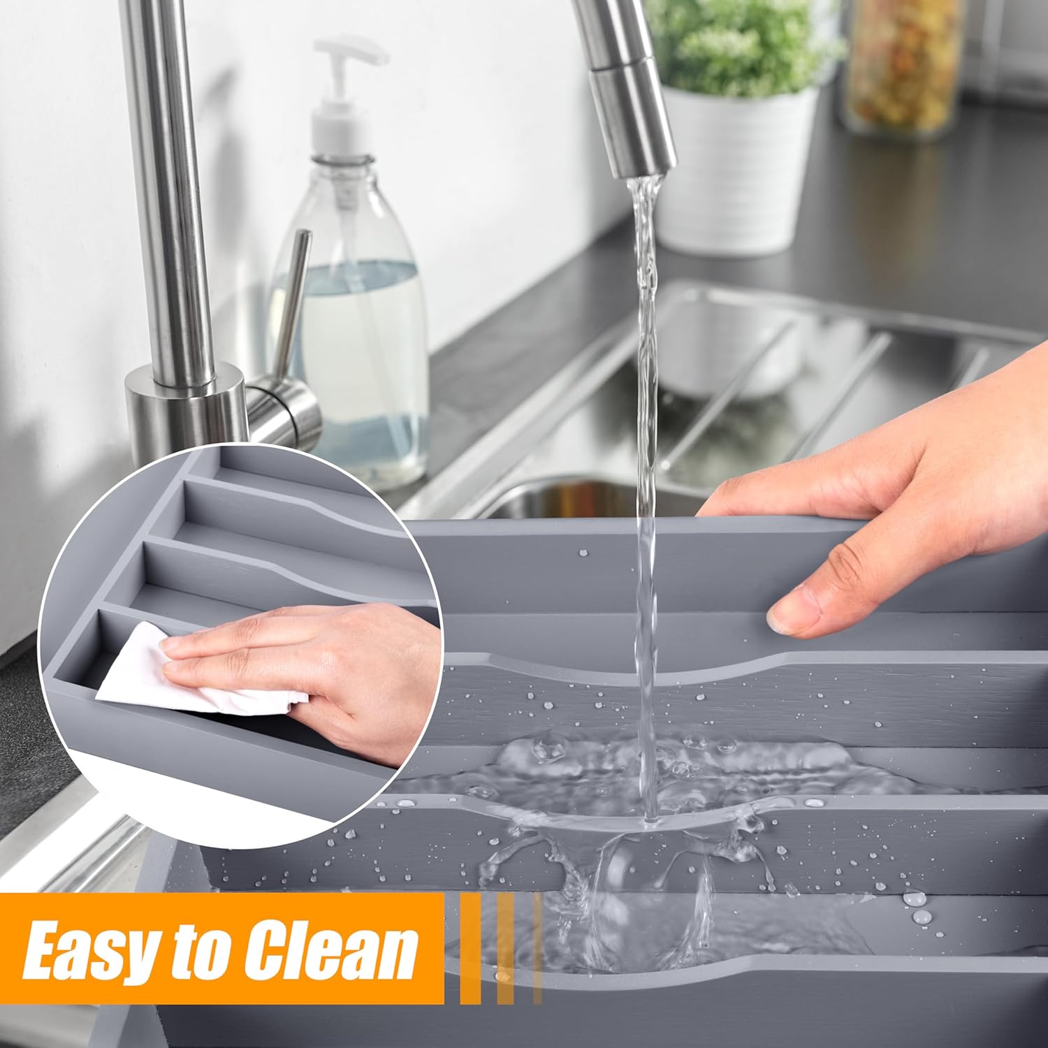 • ✅【Deep Compartments & Reinforced Base】Our utensil drawer organizer features compartments with a depth of 1.9 inches, helping maximize drawer space and perfect for storing more essential tools and gadgets. The utensil silverware drawer organizer flatware cutlery tray comes with a reinforced base, ensuring durability for long-term use, and is ideal for supporting the weight of heavy-duty utensils and knives. Keep everything you need conveniently at hand while cooking, neatly visible, and easy to grasp when preparing the next meal in the kitchen.