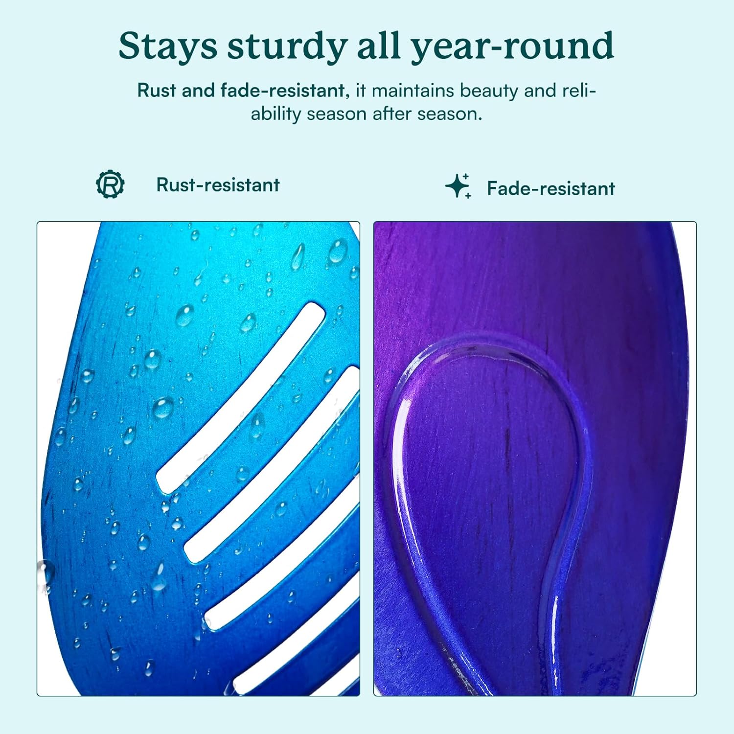 • Yard Art: The eye-catching peacock blue wind spinners perfectly complements your backyard landscape, creating a harmonious ambiance. The double rotating windmill provides a soothing experience, helping you unwind and alleviate the fatigue accumulated throughout the day