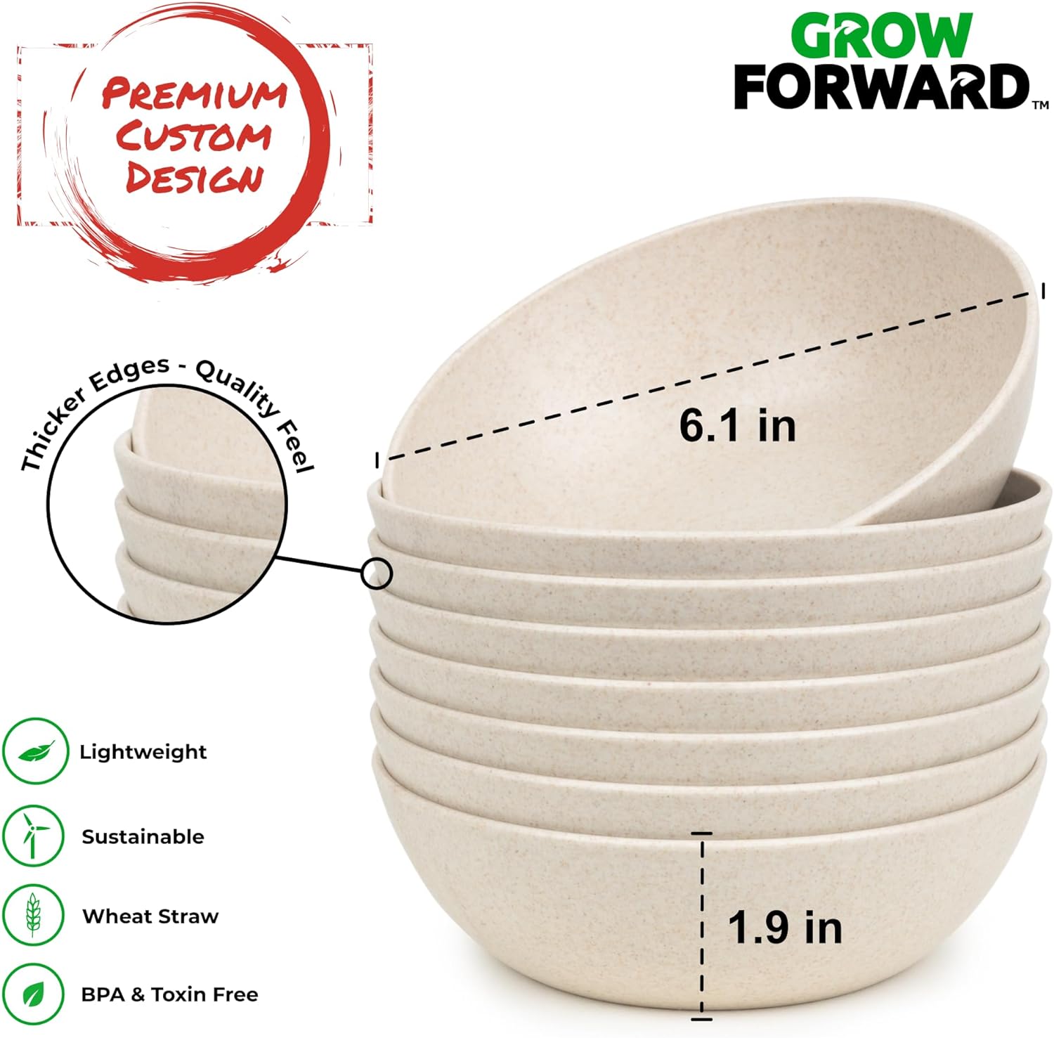 Grow Forward Premium Wheat Straw Bowls - 20oz Microwave Safe Plastic Cereal Bowls Set of 8 for Kitchen, Camping, RV, Dessert, Snack, Soup, Salad, Fruit - Reusable, Unbreakable & BPA Free - Sahara