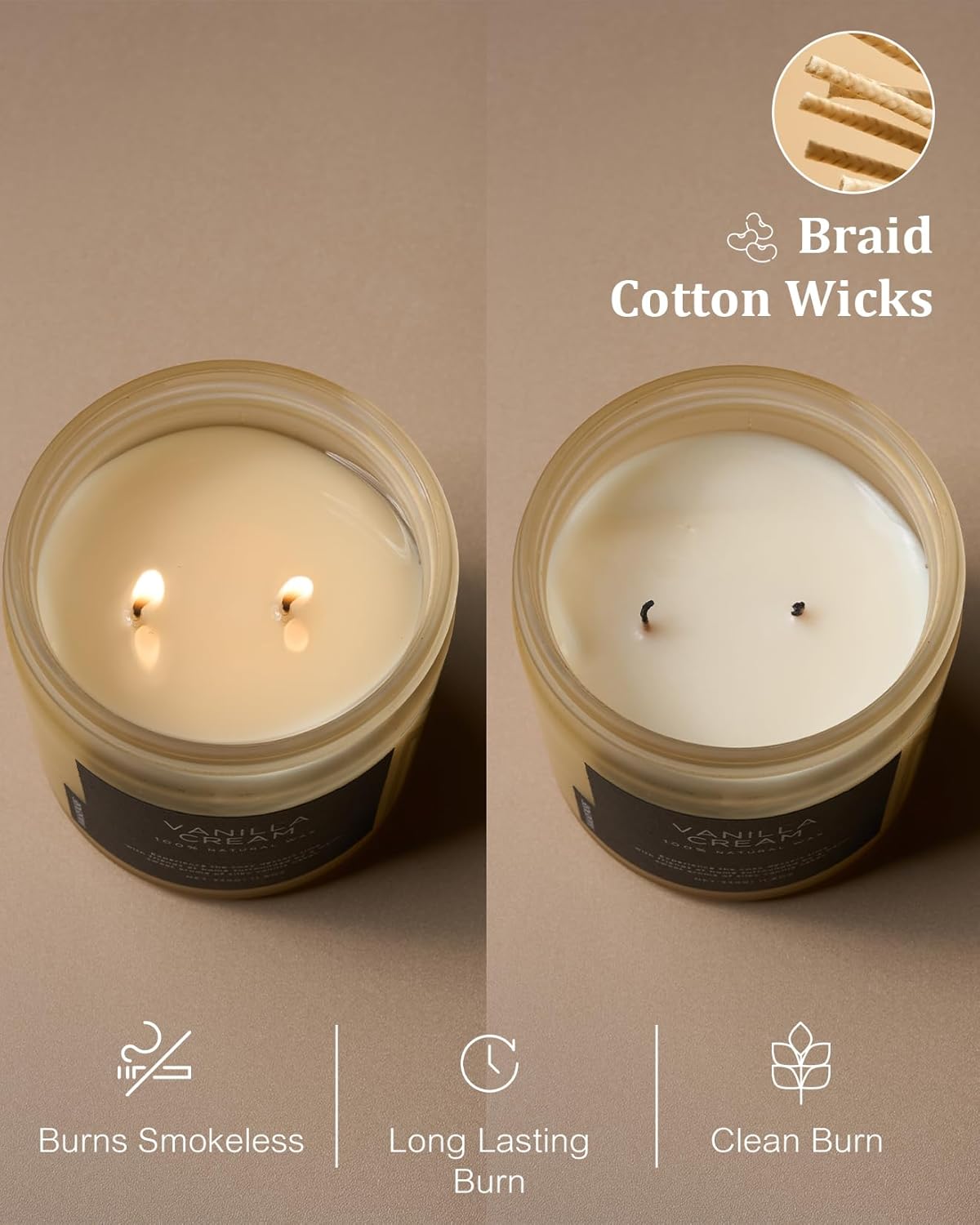 • ๐ŸŒณ Clean Consistent & Even Burn - Using 2 American made lead-free cotton wicks for a even burn result. They're cotton flat braid wicks with paper throughout, providing increased rigidity and burn more consistently than 100% cotton wicks. Designed to reduce carbon buildup which leads to black soot.