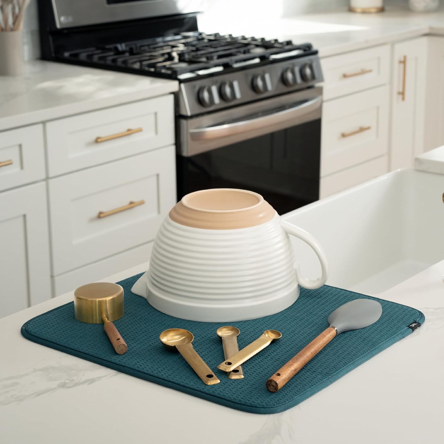 • Dish drying mats for kitchen counter are reusable, machine washable, and easy to store for kitchen organization; durable construction will not chip or break like a stone dish drying mat for kitchen