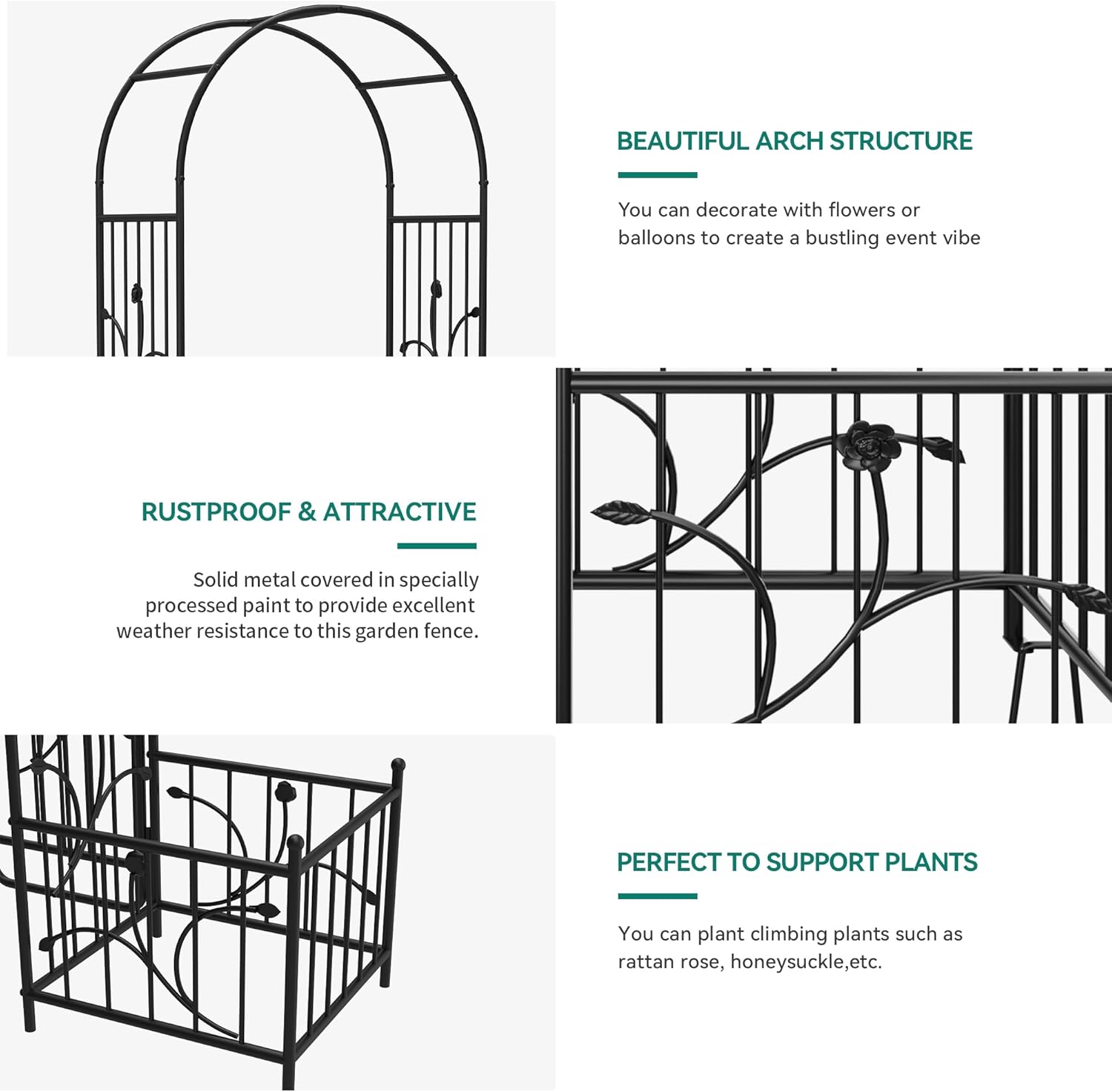 • Durable & Stable: Sturdy steel tubing is treated with weather-resistant black epoxy to ensure stability and prolonged outdoor use; The reinforced supporting frame at the bottom features ground stakes so that the garden arch can withstand weather elements.