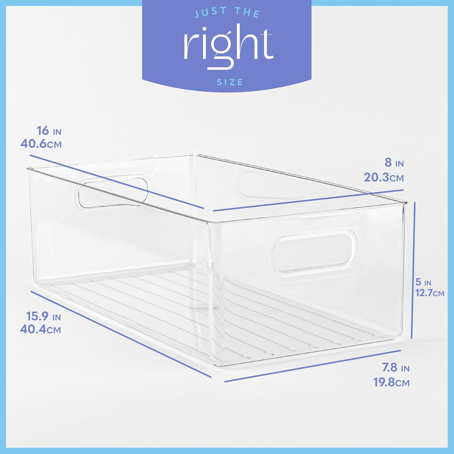 Plastic Food Storage 2 Pack Clear Container Bin with Handles for Organizing Kitchen, Pantry, Refrigerator, Freezer, Pantry, Cabinet, Closet, Bathroom. 16”x8”x5”