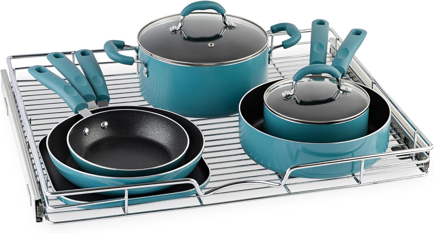• HIGH QUALITY: Made of durable metal with chrome finish the pull out shelf for kitchen cabinet is simple and easy to install. Designed to fit any style of cabinetry and easy to clean.