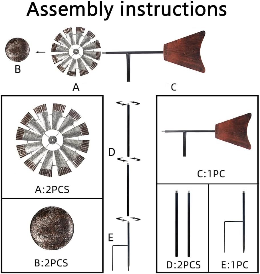 • EASY TO INSTALL:Simply tighten the screw at three places and insert it into the soil. The durable kinetic wind spinner comes with stabilizing metal stakes to ensure it stands firm in windy weather