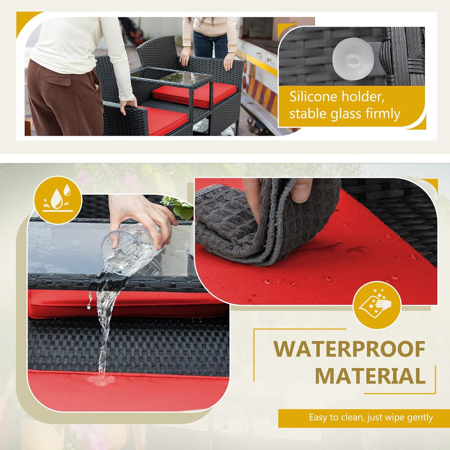 Flamaker Outdoor Furniture Patio Loveseat Wicker 2-Seat with Built-in Table and Cushions Rattan Porch Chairs Bench for Balcony, Lawn, Backyard (Red)