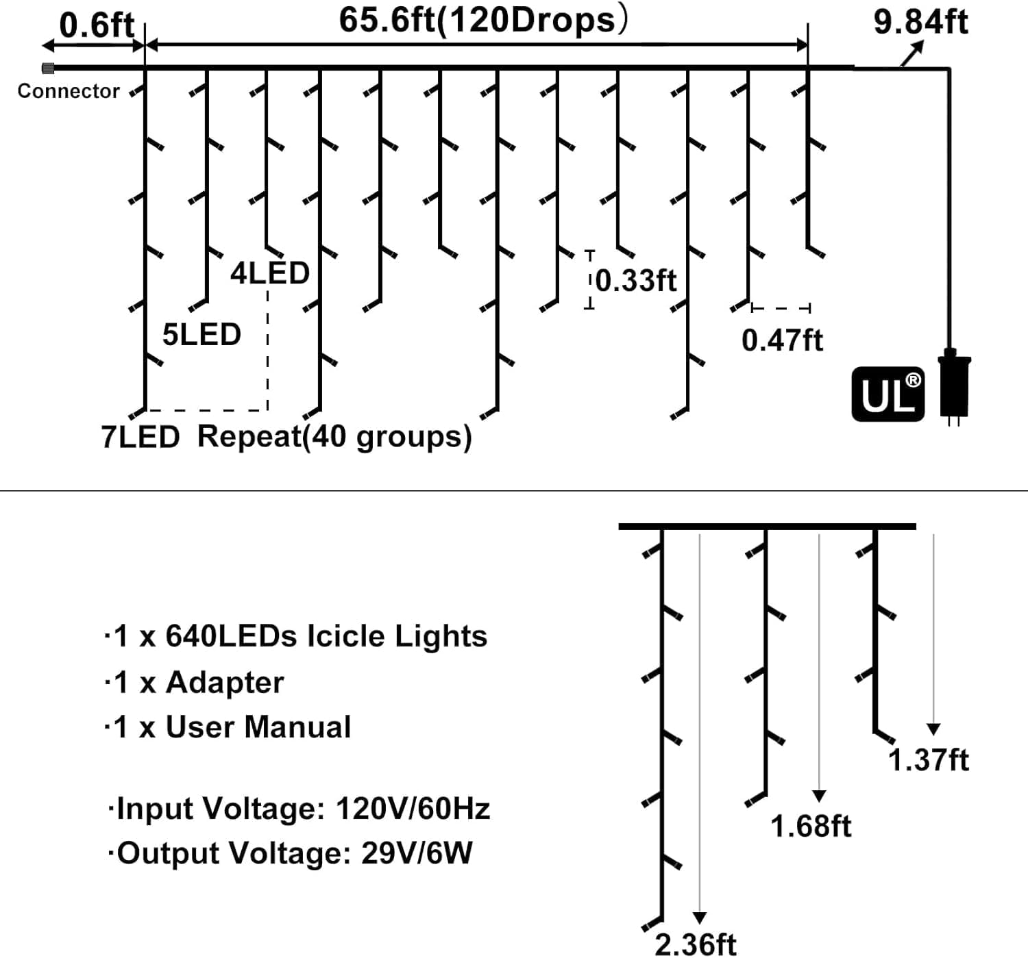 • Waterproof: The outdoor Halloween decorations is perfect for outdoor using, including heavy rain and snow. Sealed LED beads, thick gauge wire and coating all are IP44 waterproof, they make the outdoor icicle lights durable and worked great through the season. But please kindly note that the plug is not waterproof, please do some protection or keep them away from water.