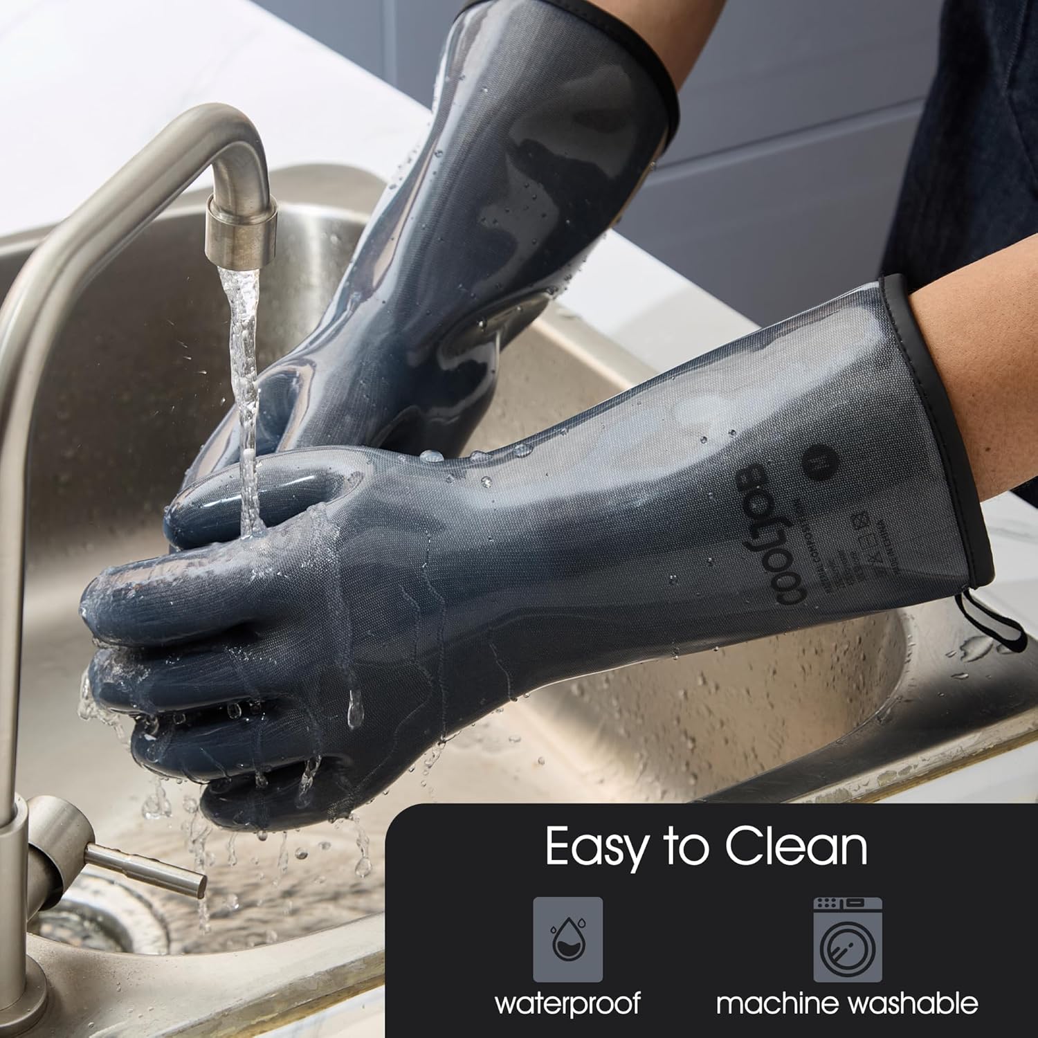 • High Quality Liquid Silicone Gloves: The kitchen gloves are made of Food Grade odorless silicone. With 13-inch sleeve, the gloves provide perfect protection for your hands and arms, defense against hot water and steam.