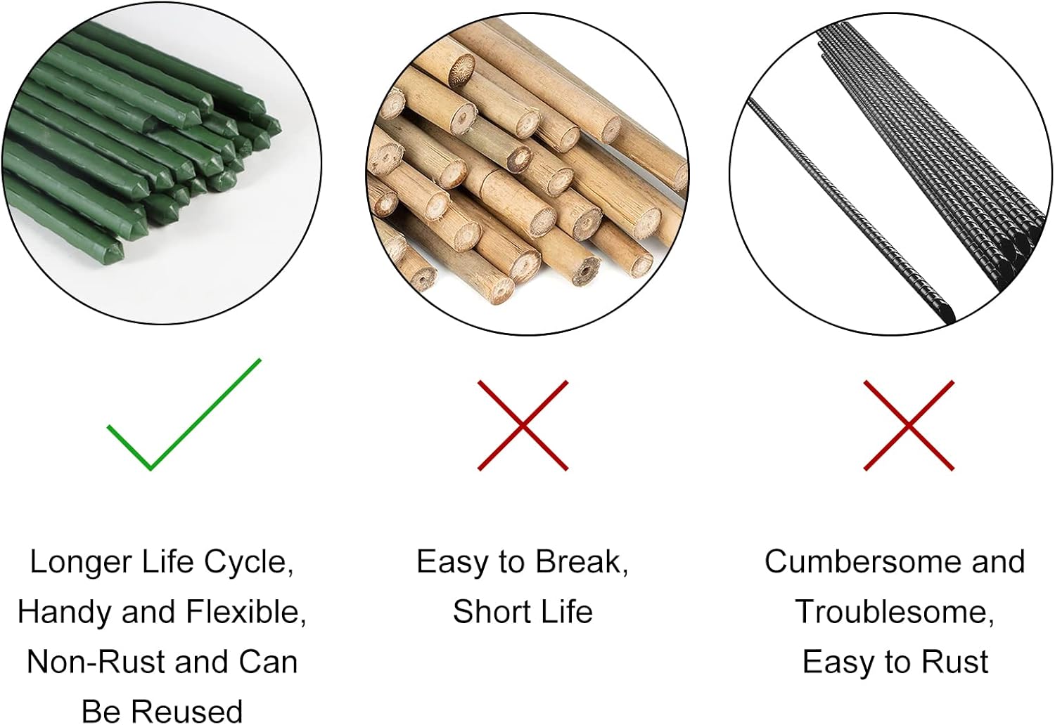 • Sturdy Garden Stakes: The garden stakes are made of sturdy hollow steel, and the surface is covered with a non-fading green plastic coating for weather and rust protection, have a longer life cycle than bamboo stakes and wood stakes, more handy and flexible than rebar and, can be reused.