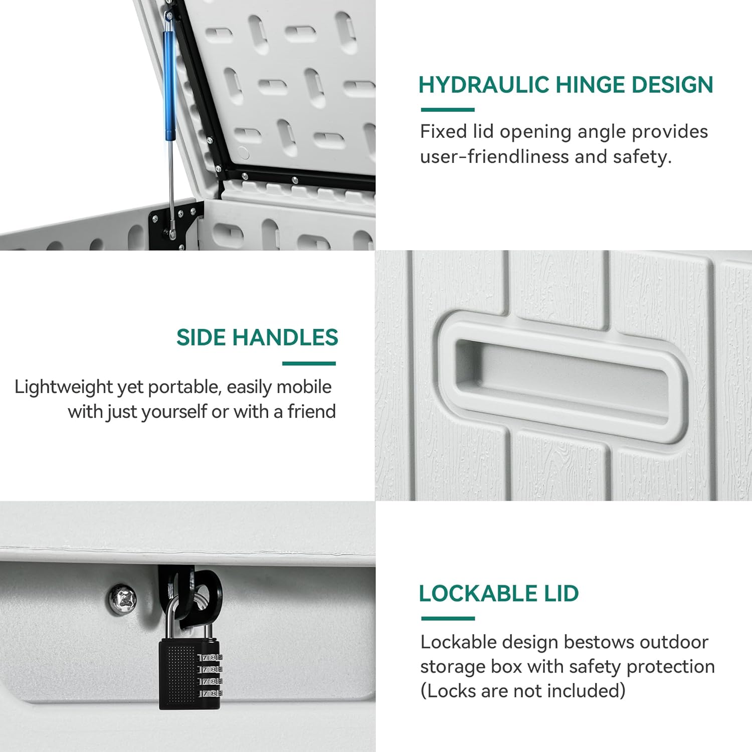 • Versatile Design: The large deck box features a built-in divider and two matching slots for classified storage; Upgraded gas strut design ensures smooth operation, while convenient side handles make movement easy; A lockable lid offers secure storage