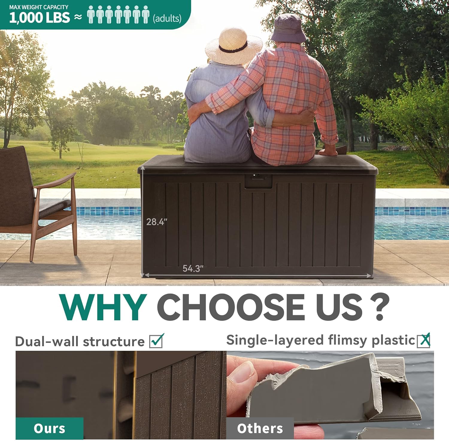 • Double-Layer Structure: Our all-weather resin deck box stands out with a double-layer structure and enhanced with internal reinforced steel beams, providing durability and resilience for outdoor use