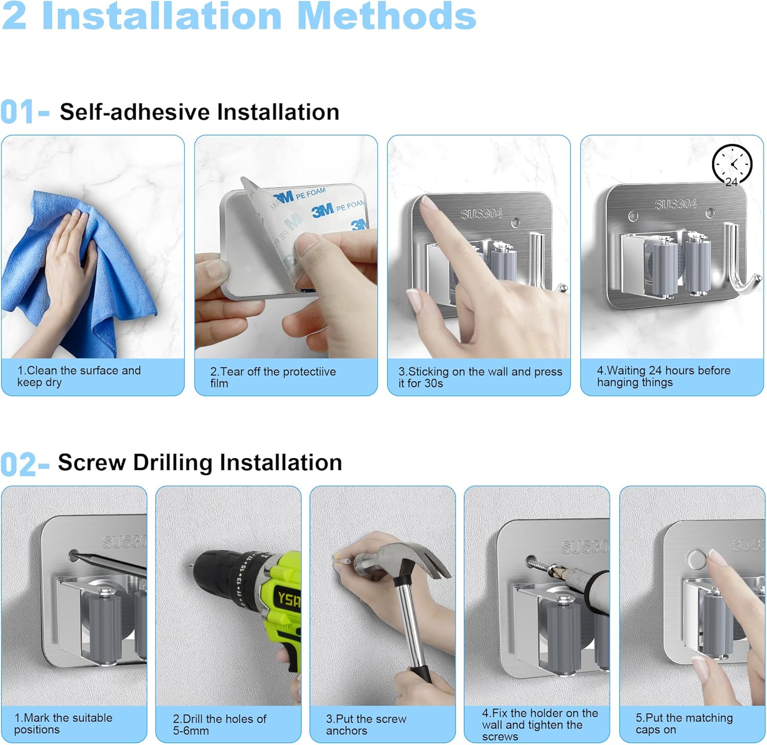 • Dual-Option Installation: Choose the convenience of 3M self-adhesive for damage-free mounting or opt for screw drilling for an even more robust hold—either way, installing this broom hanger wall mount is a breeze