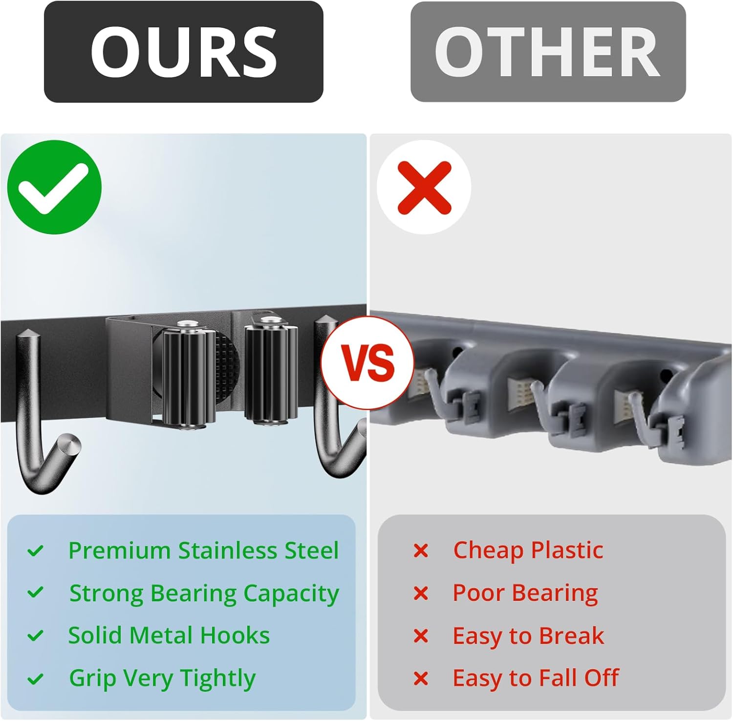 • 🏡【STURDY BROOM HOLDER】Each broom holder wall mount has 3 racks 4 hooks. Made of sturdy 304 stainless steel, the broom holder is corrosion-resistant, rustproof and waterproof. Compared with the plastic broom rack, it is more stronger and has a longer service life.