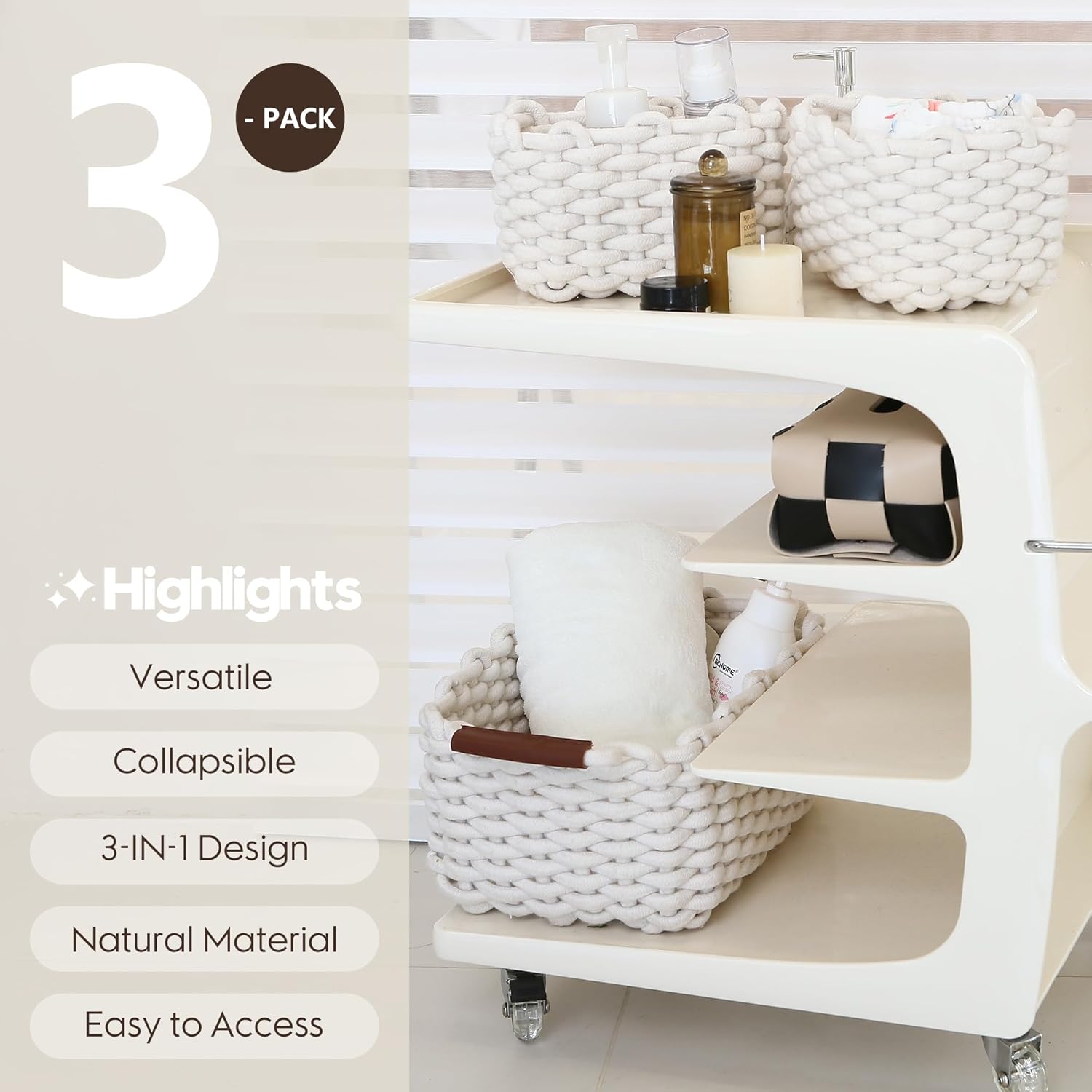 • Versatile Storage Solutions - Set of 3 storage baskets provide an efficient solution in your home, office and even trunk to meet many storage needs such as organizing underwear, socks, towels in the wardrobe, storing snacks, condiments, candies in the closet, and gathering toys, baby products, pet products, chargers, cables, etc