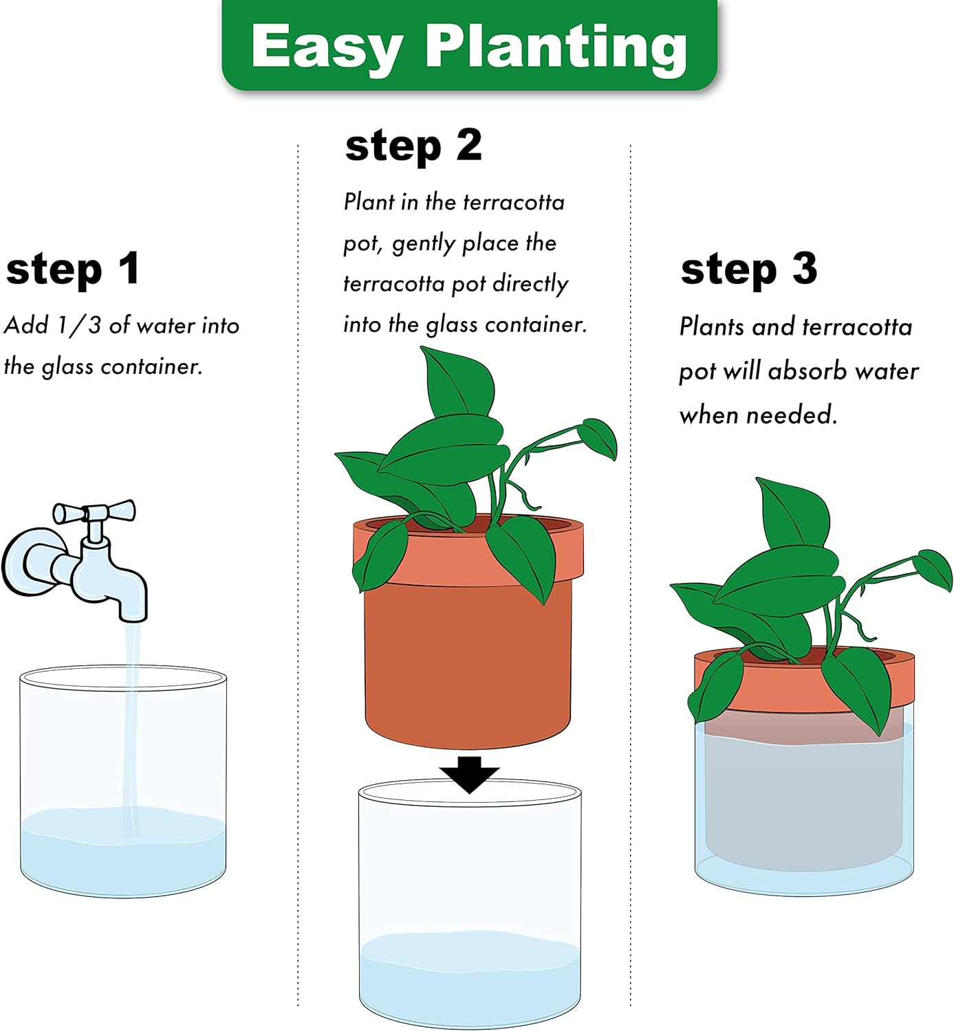• Self-watering System: The terracotta pot is unglazed, just fill the glass container with water to ensure plants will absorb only what they need through the terracotta pot walls.