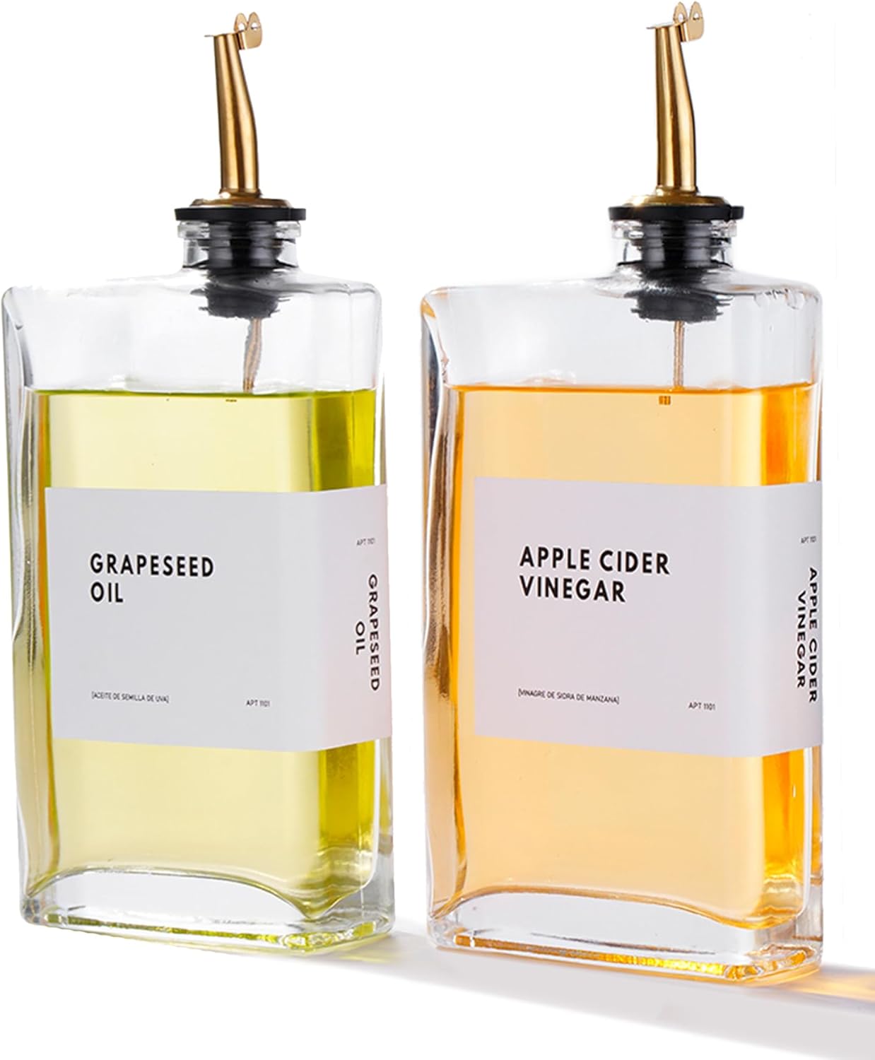 • Versatile Usage. Use it as a drizzle olive oil container, vinegar dispenser, soy sauce bottle, coffee syrup bottle or vinegar and oil dispenser set — this olive oil bottle dispenser suits various needs. It also comes with a 36 designed water-proof, weather-proof label set for your custom use.