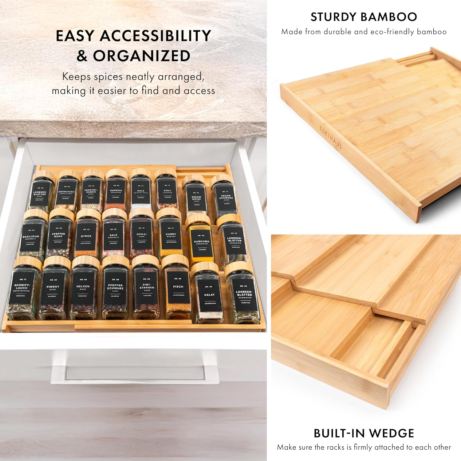• DURABLE SEASONING RACK: Made from strong natural bamboo, this spice organizer drawer is lightweight, resistant to warping and staining, and easy to clean, perfect for maintaining an organized kitchen.