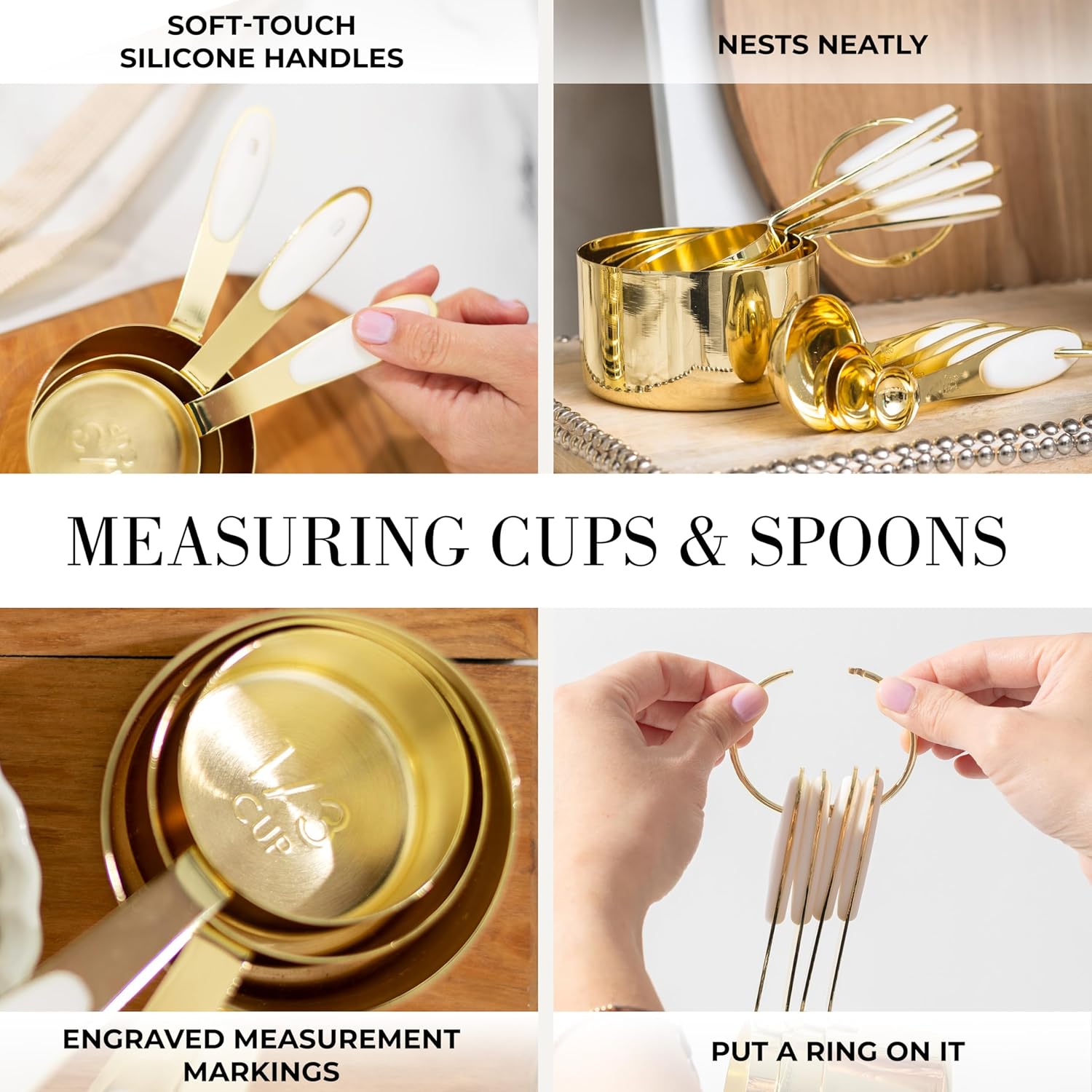 • FEEL THE QUALITY, SEE THE SPARKLE! Crafted with love from high-grade stainless steel and finished in stunning gold, these white and gold utensils set and gold measuring cups and spoons set are built to last and designed to impress. Each piece feels as good as it looks—sturdy, stylish, and just a bit show-offy. Ready to upgrade? Dive into a set that blends beauty with beast-mode durability, and make your kitchen the envy of every home chef!