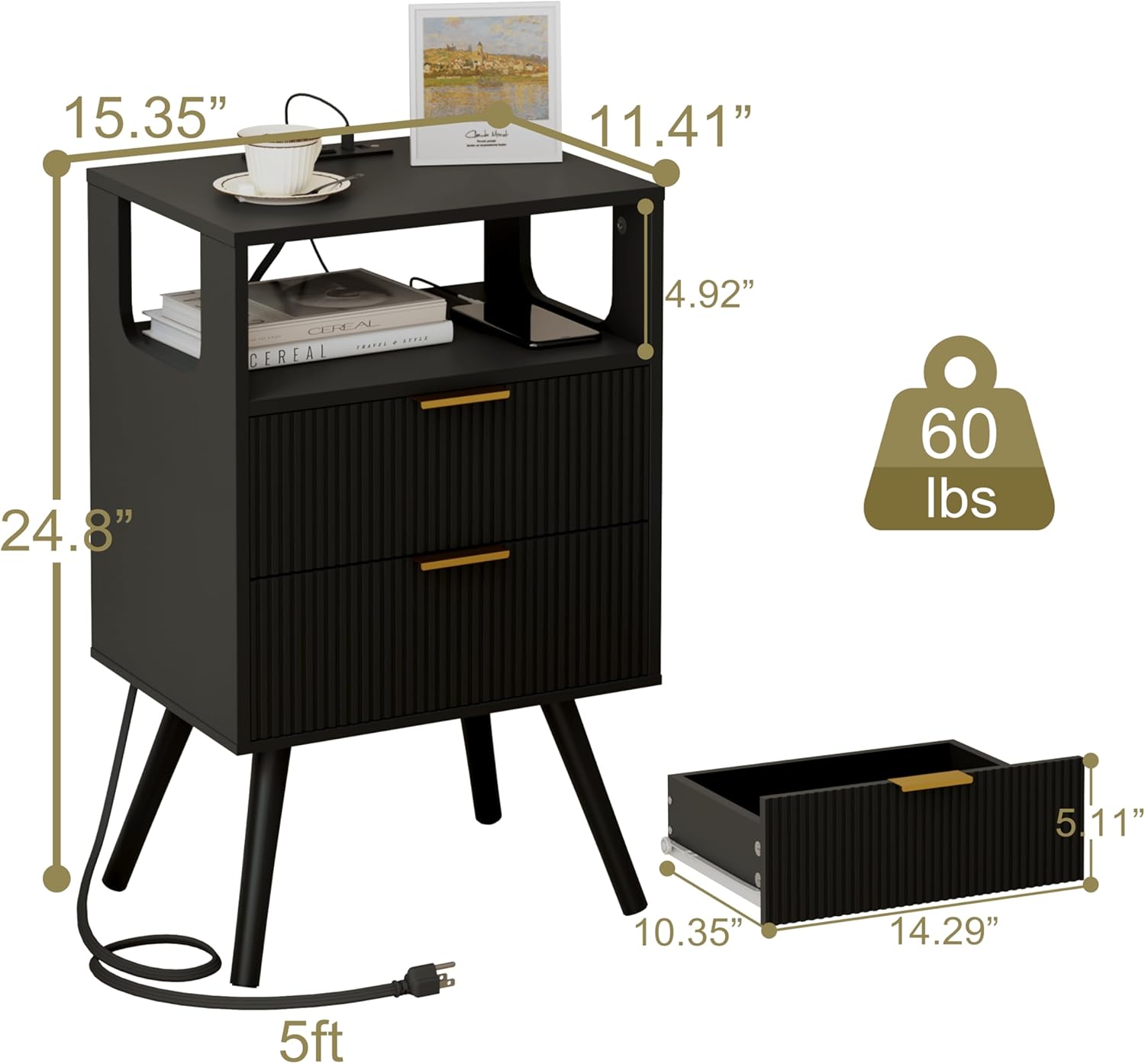 Black Nightstand with Charging Station and LED Lights,Modern Bedside Table with 2 Storage Drawer and Open Wood Shelf, for Bedroom and Small Spaces,Night Stand with Solid Wood Legs,Black