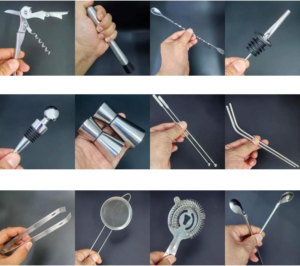 • Included Components : 22-Piece Bartender Tool Kit Includes:1*25/20 oz Shaker Cup,1*25/50ml Jigger,1*15/30ml Jigger,1*ice Strainer, 1*colander, 1*ice tongs, 1*muddler, 1*fork&spoon, 1*corkscrew, 2*mixing rod, 2*straw spoon, 2*curved straw, 4*pourer, 2*wine stopper, 1*Recipes Booklet, 1*black arylic stand. 22-Piece Bartender Tool Kit Includes:1*25/20 oz Shaker Cup,1*25/50ml Jigger,1*15/30ml Jigger,1*ice Strainer, 1*colander, 1*ice tongs,… See more