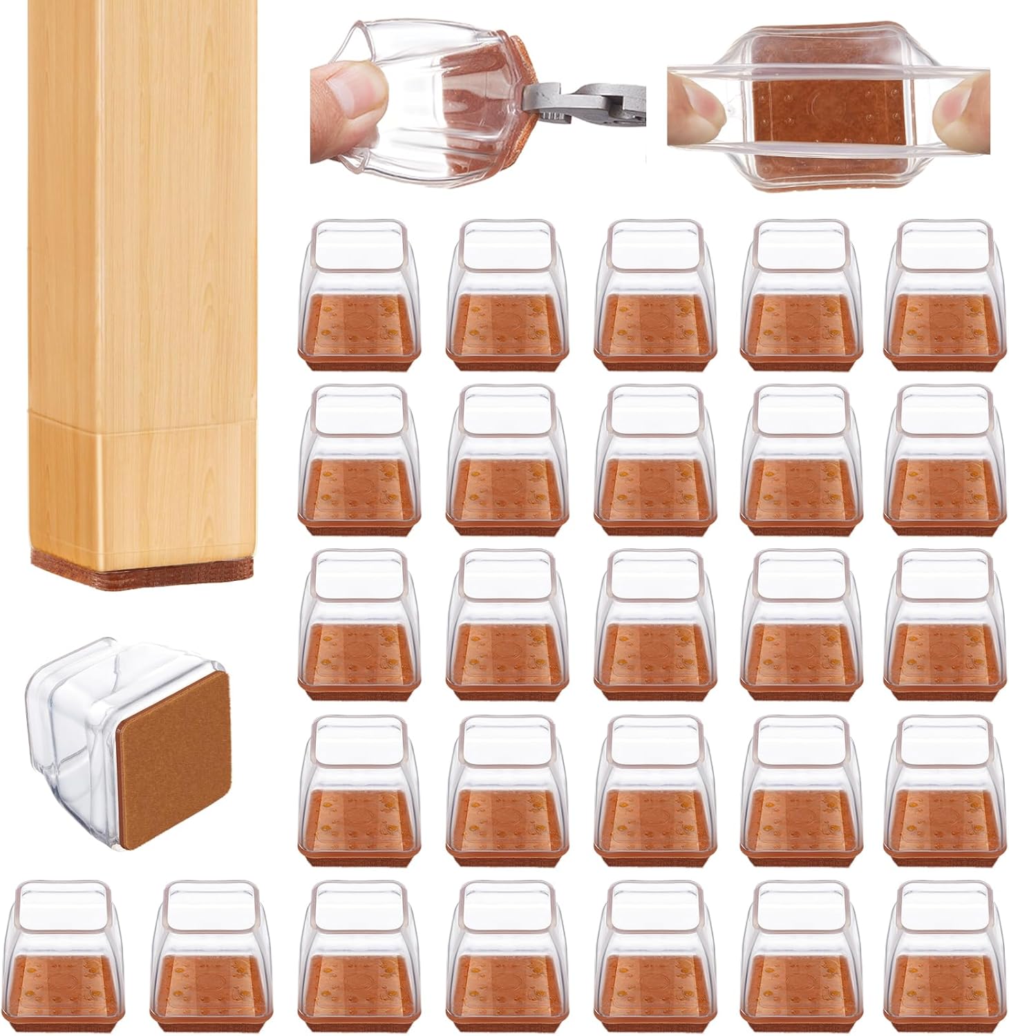 • APPLICABLE SHAPES AND SIZES: Our chair leg floor protectors only fit wooden square chair legs. Compared with the round chair leg caps, the square chair leg floor protector fits the square chair leg better. We have tow sizes chair leg protectors for hardwood floors.Please measure the size of your furniture feet before buying.The S size chair leg floor protectors square is suitable for square leg with side length 1/2" to 9/10"(13-23mm), irregular leg with perimeter 2-2/5" to 3-3/5" (52-92mm).