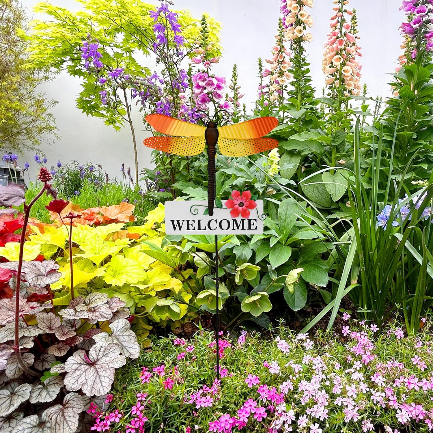 • EASY INSTALL: Decorative garden stake comes in 3 parts, which are pretty easy to assemble. Just screw the dragonfly and stem together by hand,then insert the welcome sign, no tools needed. Dragonfly metal yard art stake will bring more refreshing feel of nature for your pathway,walkway, planter etc.