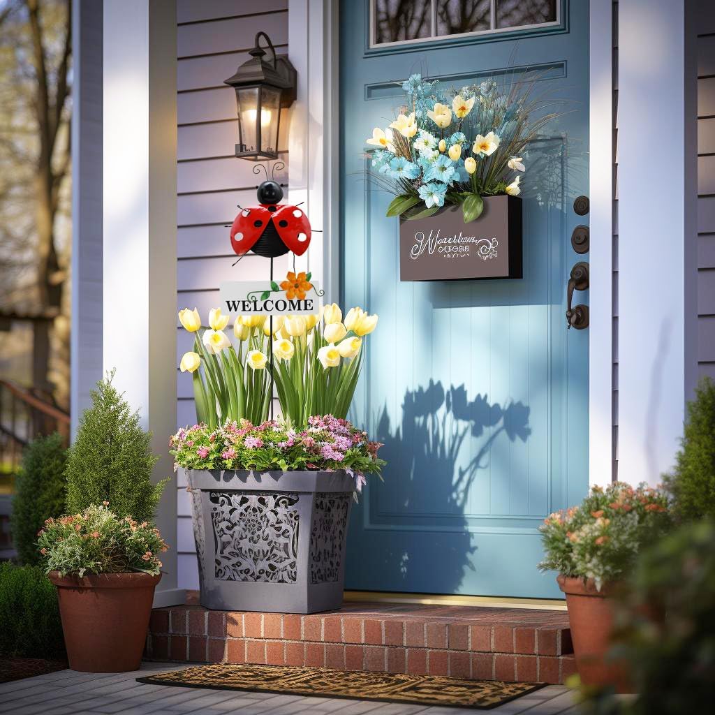 • DETAILED GARDEN DECOR: Metal ladybug garden stake is hand painted with vivid red colors and decorated with flower and welcome sign. The garden stake decor will definitely be an eye catching garden decor. The garden decor insect is connected to the stems by springs, when the breeze blows, it will nod or shake head and look lifelike.