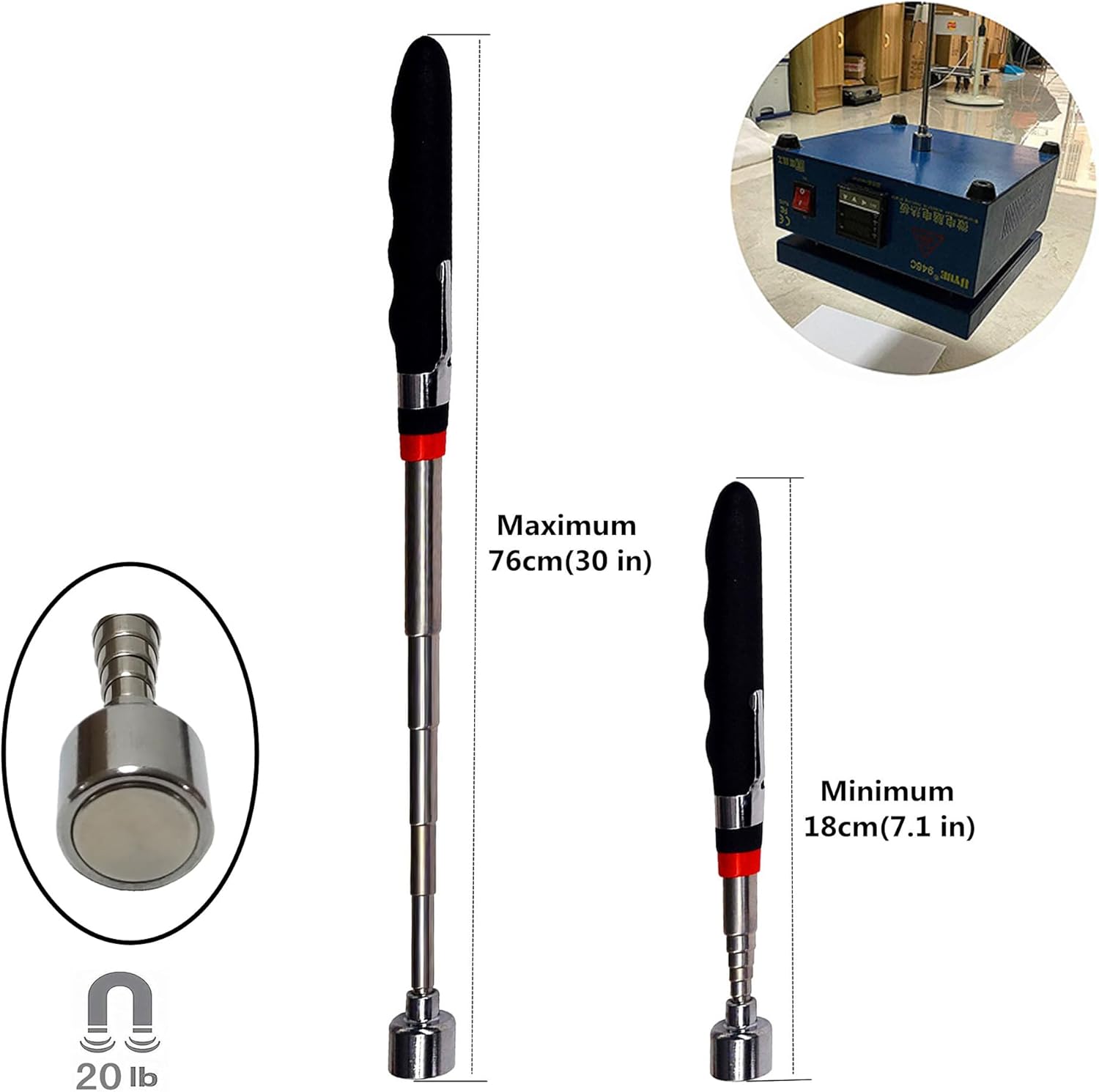 • 2、35 lb pickup: stretching up to 103CM (40.5IN), shortening up to 22CM (8.6IN), magnet head diameter of 3.5CM (1.37IN); 20 lb pickup: Stretching up to 76CM (30IN), shortening up to 18CM (7.1IN), magnet head diameter of 2CM (0.8IN)