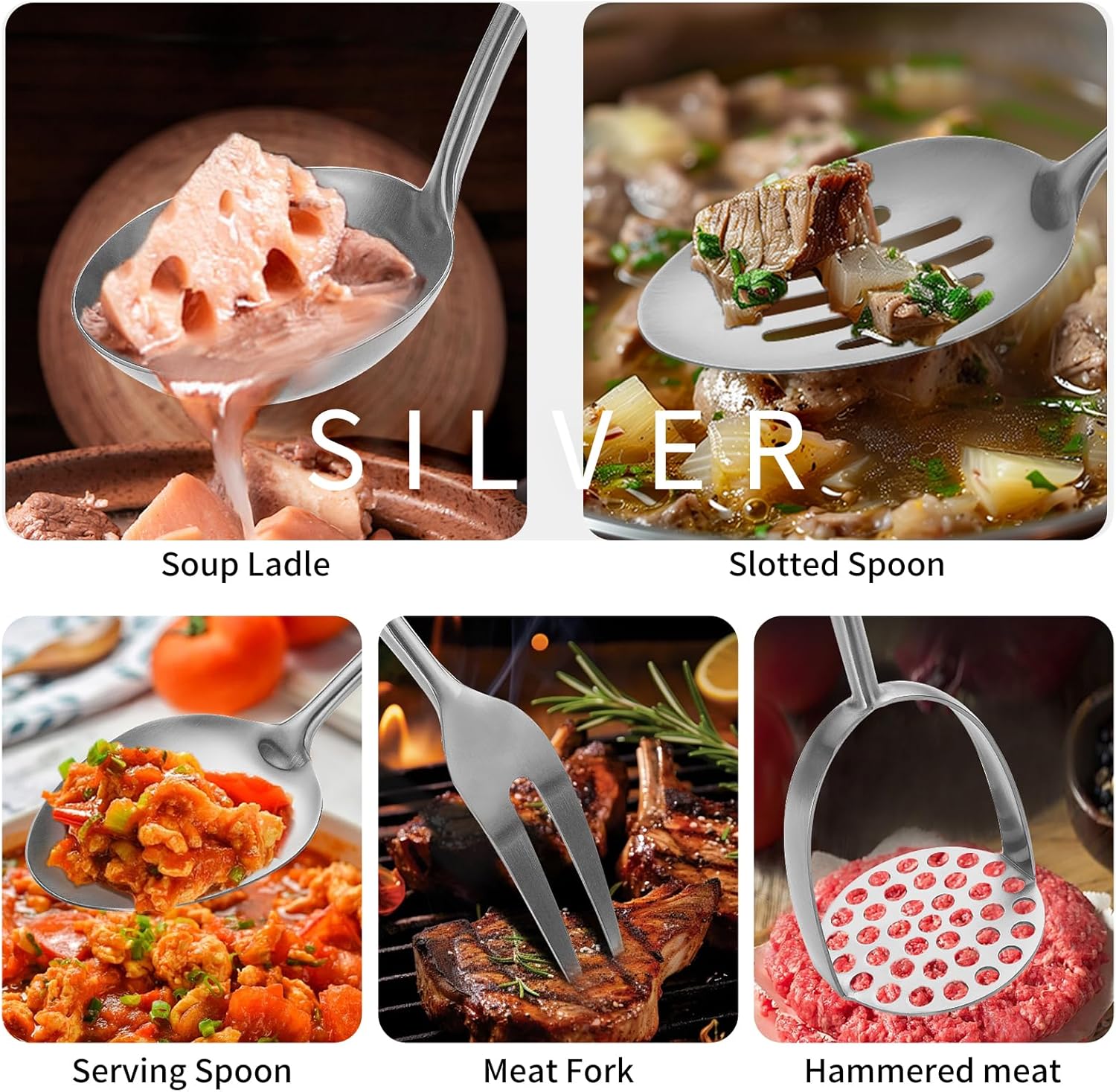 • 12Pcs Kitchen Utensils Set: Lazycorner Utensils Serving Set consists of 1 Soild Turner, 1 Soup Ladle, 1 Slotted Spoon, 1 Slotted Spatula Tunner, 1 Pasta Server, 1 Large Spoon, 1 spaghetti spoon, 1 Serving Spoon, 1 Slotted Spoon, 1 Meat Fork, 2 Serving Tongs. Enhance your cooking experience with 11 kitchen accessories that perfectly for your cooking needs