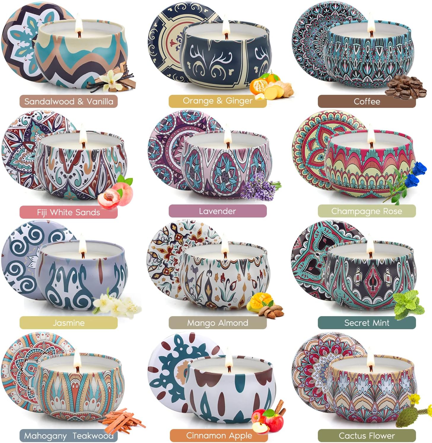 • ✅Scented Candles Gift Set - Contains 12 Scents: Champagne Rose, Vanilla, Orange, Coffee, White Peach Sandalwood, Lavender, Jasmine, Mango Almond, Secret Mint, Mahogany Teakwood, Cinnamon Apple, Cactus Flower.
