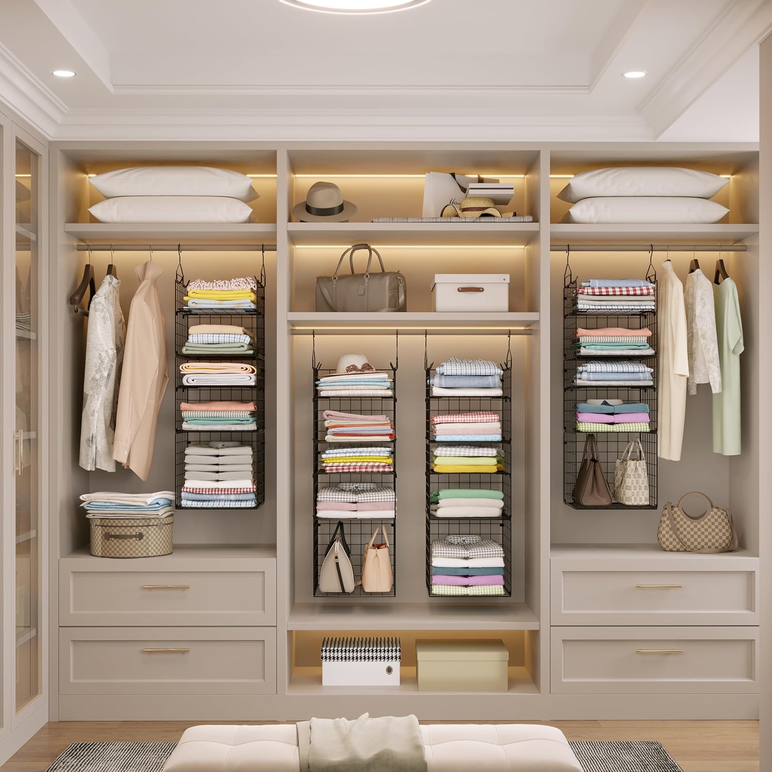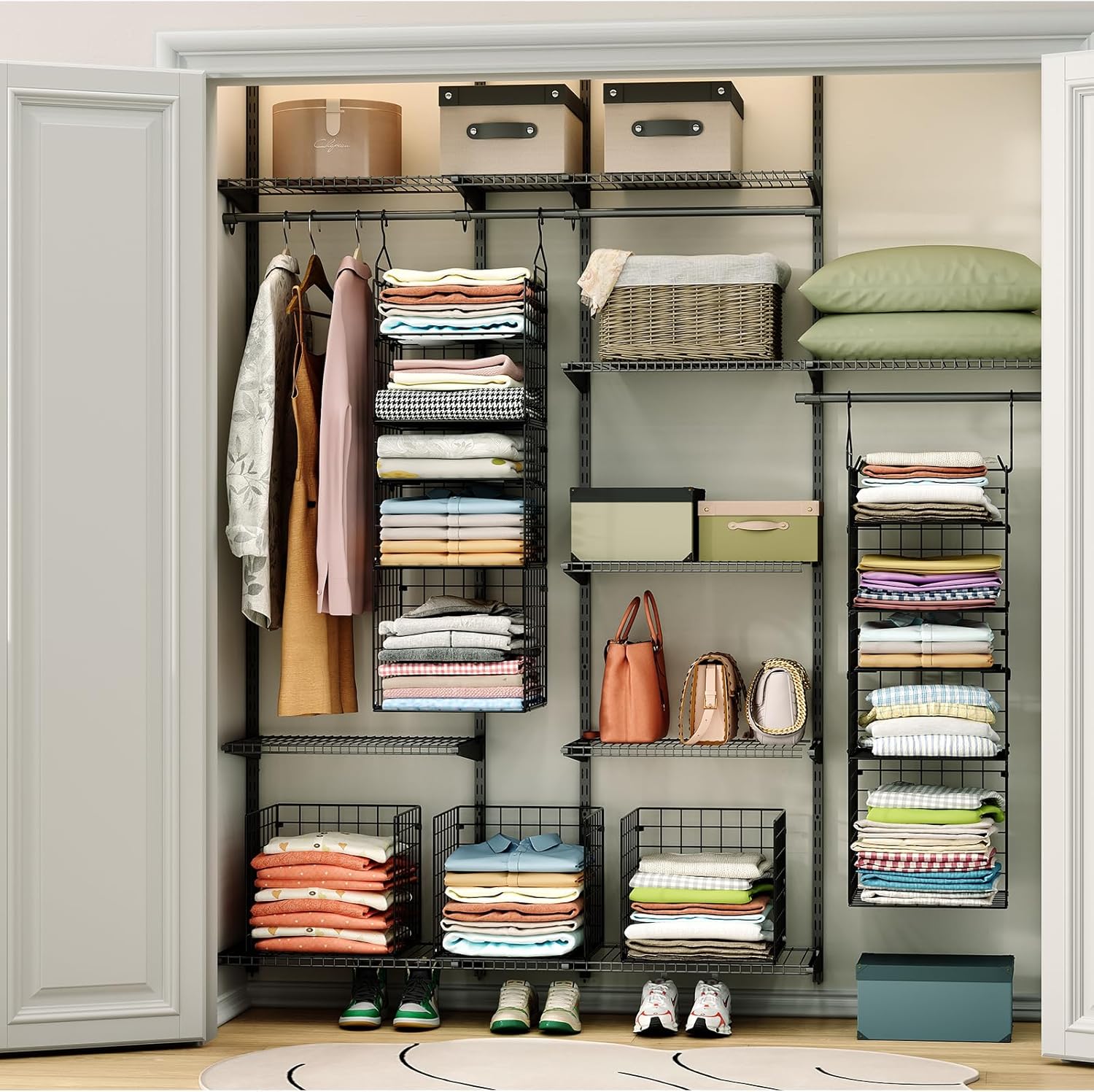 • 【High Quality & Heavy Duty】This hanging closet organizer is made from high quality carbon steel, durable, stable, bearing 35 lbs without deformation.