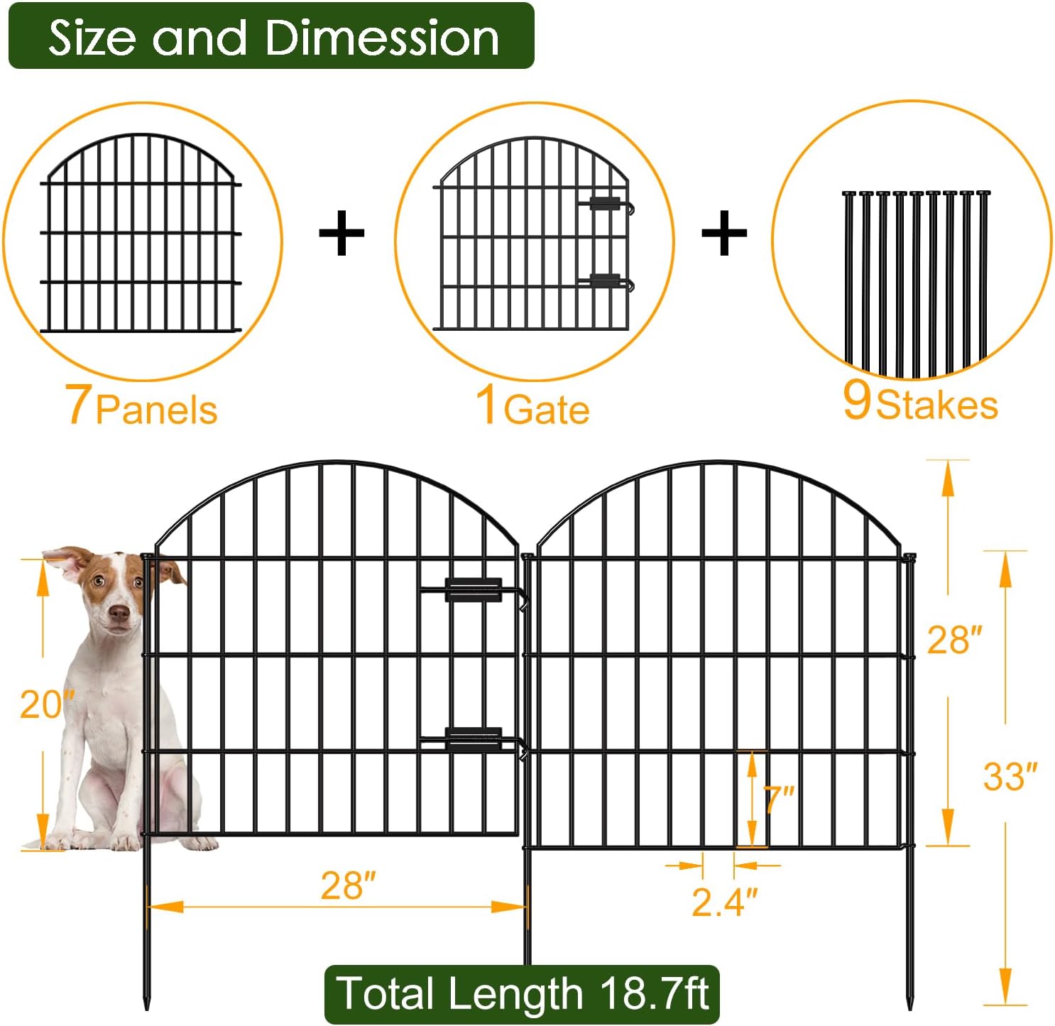 • WHAT'S INCLUDED: 1 Gate + 7 Fence Panels + 9 Stakes in a bundle. Gate panel sized 27” (H) x 28” (W), each fence panel sized 28 inch (H) x 28 inch (W), each Stake 33 inches height, linear length 18.7 feet, Black color.