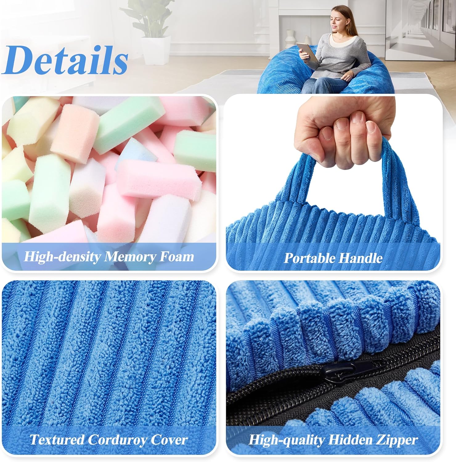 • COMFORTABLE & DURABLE FABRIC: Our bean bag chairs are made of textured corduroy, which is skin-friendly. The cover can be machine washable so that you can clean it like new. The filled memory foam is high-density, which is easily rebound and make you feel relaxed once you lie down or sit on the chairs.
