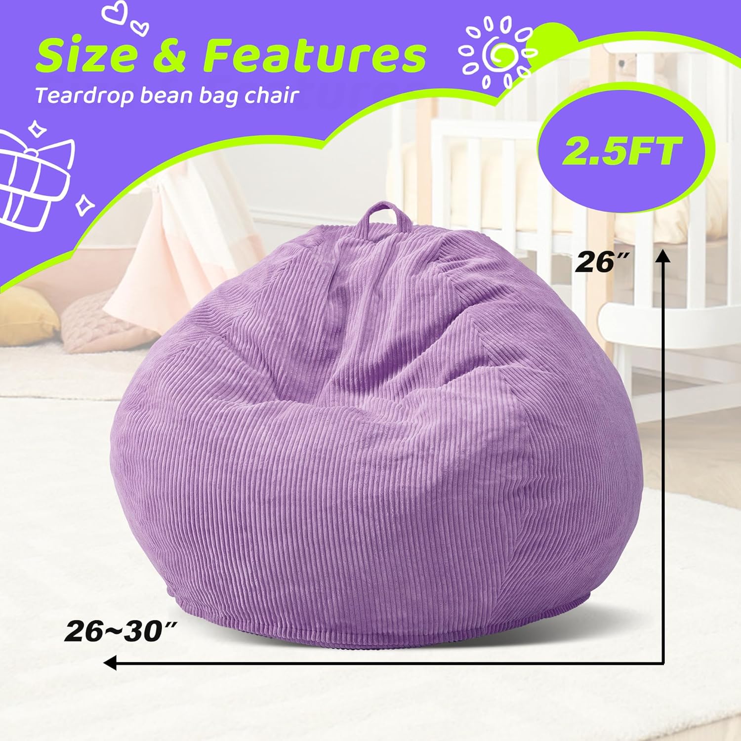 • COMFORTABLE & DURABLE FABRIC: Our bean bag chair is made of textured corduroy, which is skin-friendly. The cover can be machine washable so that you can clean it like new. The filled memory foam is high-density, which is easily rebound and make you feel relaxed once you lie down or sit on the chair.