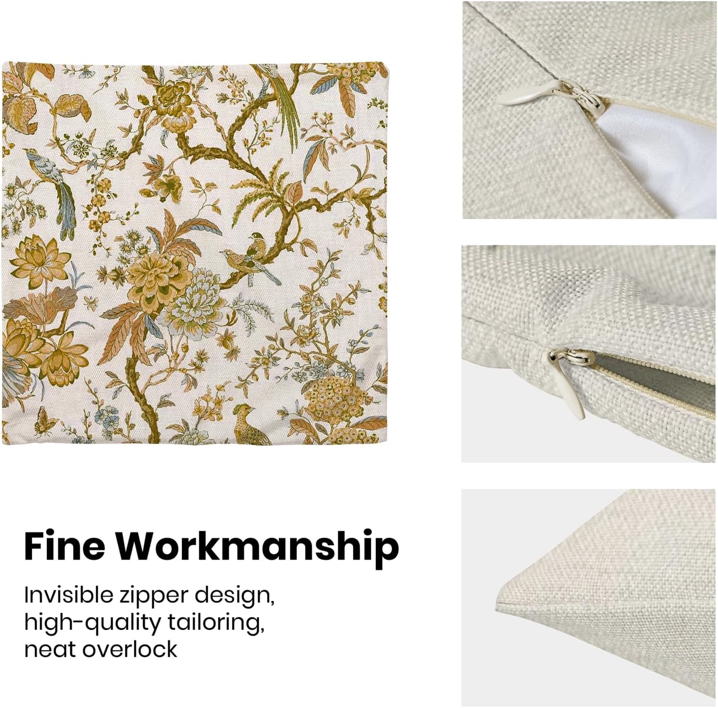 • 【Summer Pillow Covers】 Our Chinoiserie floral throw pillow covers 20x20 inch are made of excellent breathable polyester cotton fabric. The mustard yellow floral decorative pillow covers is durable, soft and skin-friendly. The plant outdoor pillow covers adopt exquisite edging technology and four sides of our spring pillow covers are sewn firmly, which is not easy to open the line.